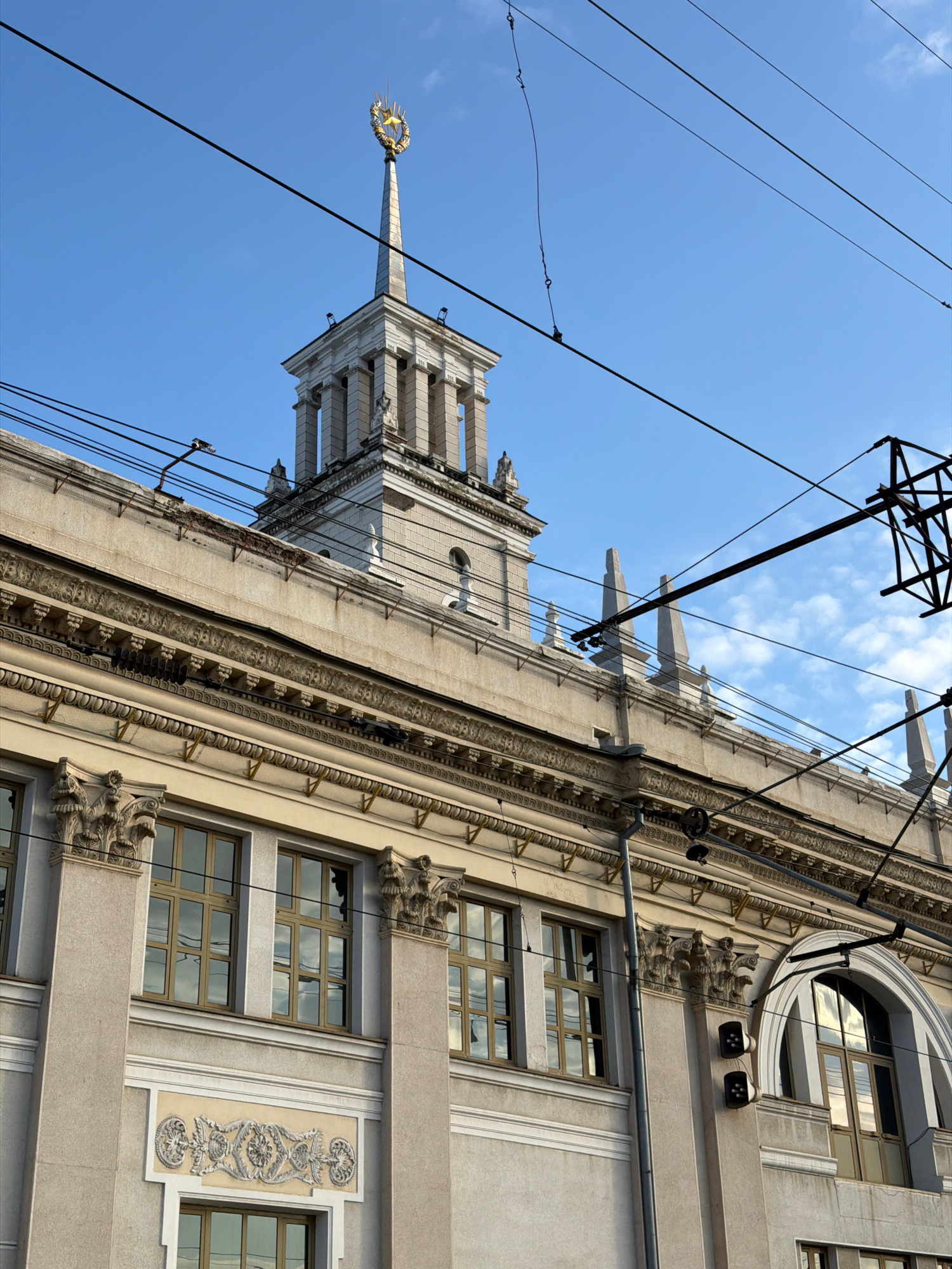 The image shows a low-angle view of a building in Krasnodar, Russia, likely the building at Krasnaya street 35. The building is light-colored, with ornate architectural details, including decorative c…read more