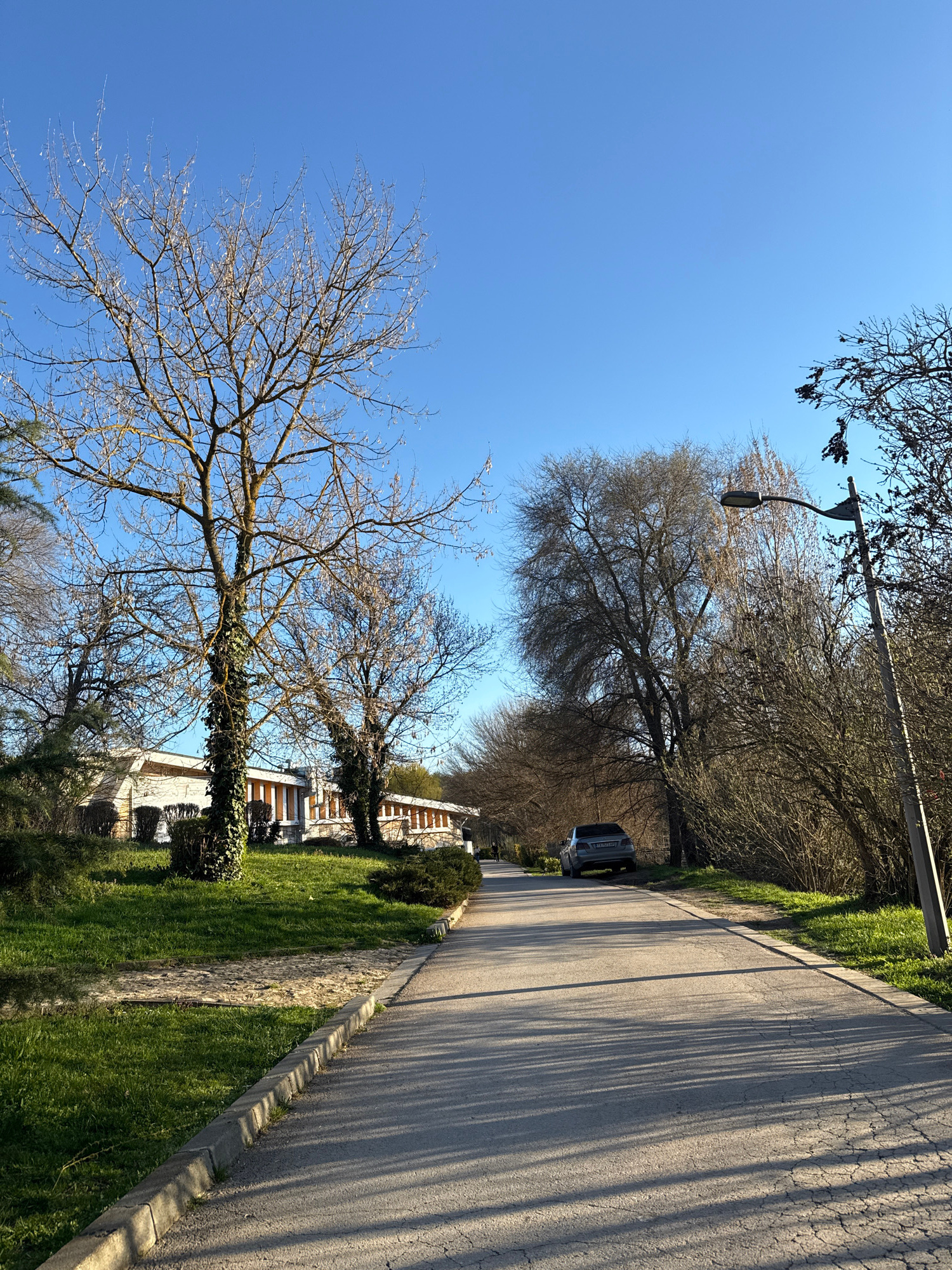 The image depicts a residential street in Dobrich, Bulgaria, captured during daylight hours under a clear blue sky. The road, exhibiting signs of wear, stretches into the distance with pronounced shadows cast across its surface. A single parked car is visible on the right side of the road. The roadside is lined with green grass and a variety of trees, some of which are bare of leaves, indicating a cooler season. Some of the buildings are clad in ivy, suggesting established architecture. A street lamp is visible alongside the road, indicating a public lighting infrastructure. The overall atmosphere is one of a quiet, suburban setting. | Open Wire