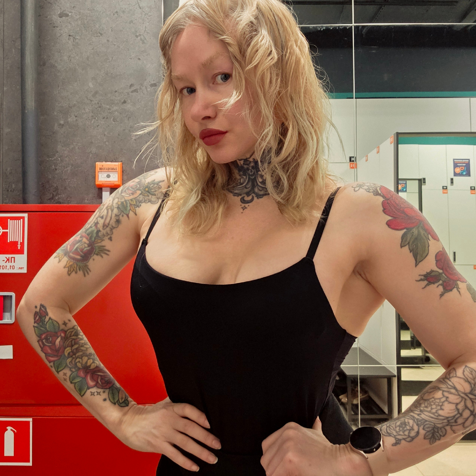 A woman with blonde wavy hair, fair skin, and several tattoos on her arms and neck stands in front of a red fire hose cabinet in what appears to be a public building. She is wearing a black tank top a…read more