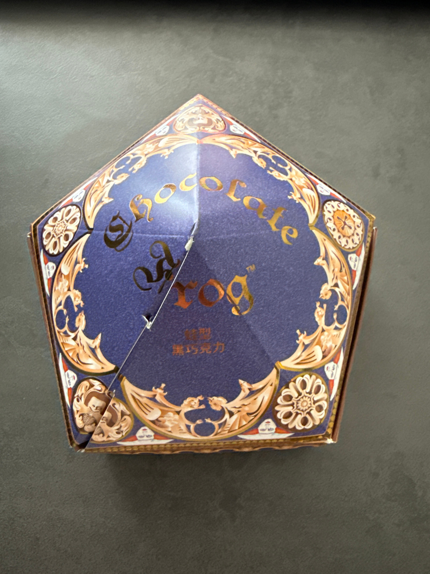 A top-down shot of a closed, pentagon-shaped chocolate box on a gray surface. The box is predominantly blue with gold lettering and an ornate gold design around the edges. The text on the box is "Choc…read more