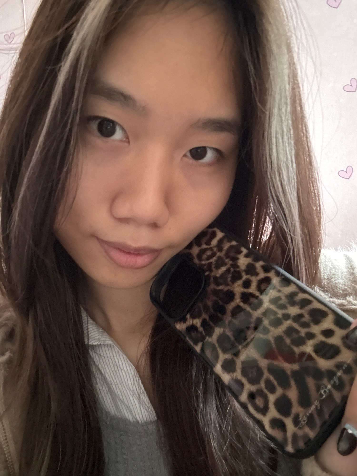 A young Asian woman with long, brown hair with blonde highlights poses for a selfie while holding a phone with a leopard print case. Her nails are painted dark. The background is a light pink color wi…read more