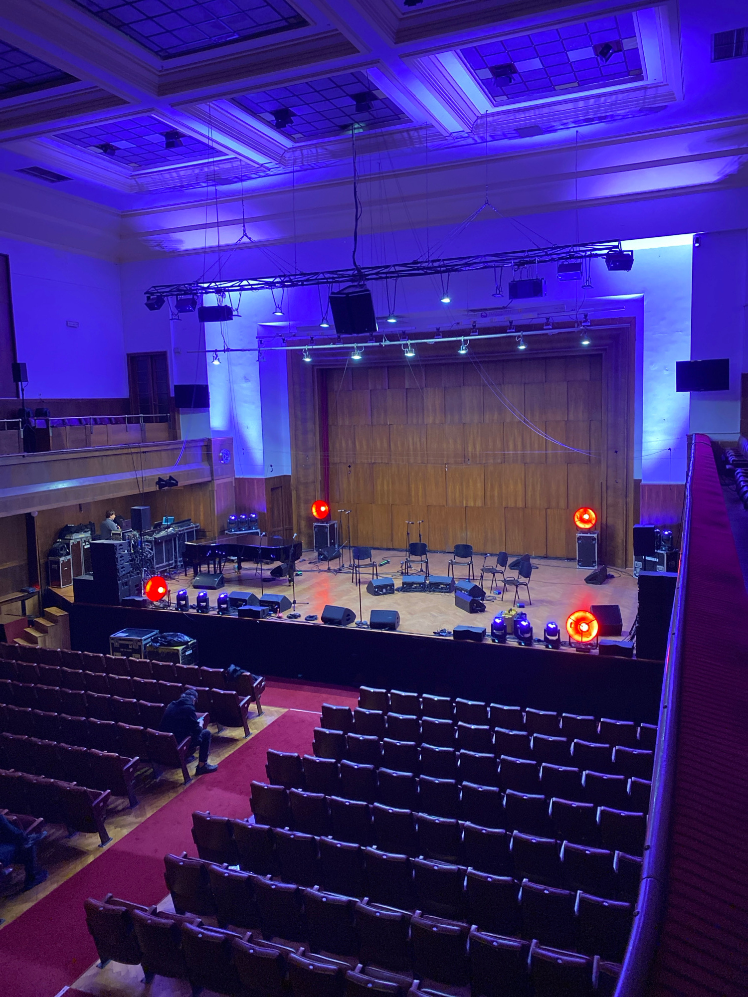The image depicts the interior of the Kolarac Hall in Belgrade, Serbia, an auditorium illuminated with blue and red stage lighting. The stage is set with musical instruments and equipment, including c…read more
