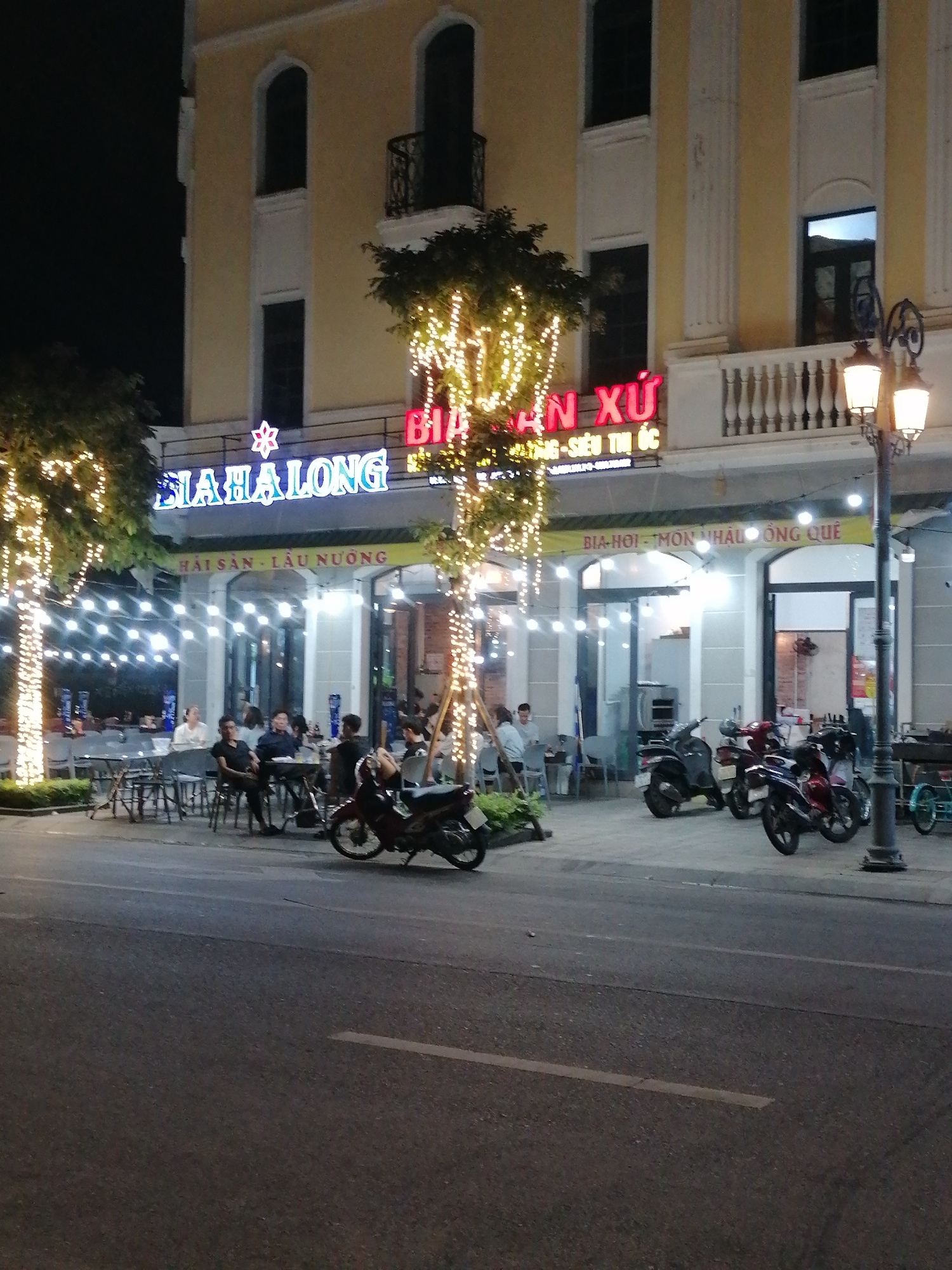 The image captures a vibrant nighttime scene at an outdoor restaurant or bar in Bai Chay Ward, Vietnam. A multi-story building with a light yellow facade and distinctive arched windows forms the backd…read more