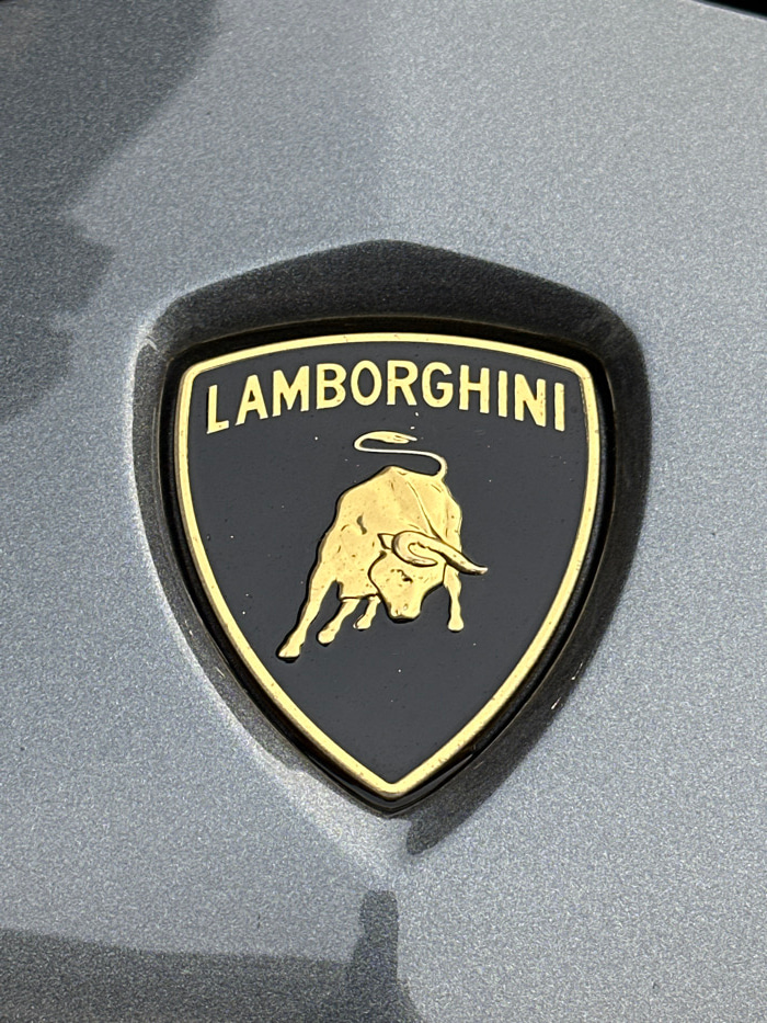 A close-up image depicts a Lamborghini emblem on a vehicle, located in Antwerp, Belgium. The emblem is a shield-shaped badge with a black field, gold trim, and gold text. Centrally featured is a styli…read more