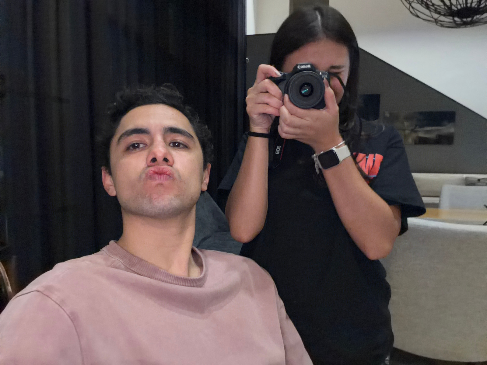 A photograph depicts two individuals in what appears to be a selfie taken in a room with neutral-colored walls and dark curtains. The image is oriented upside down. One person is holding a Canon camer…read more