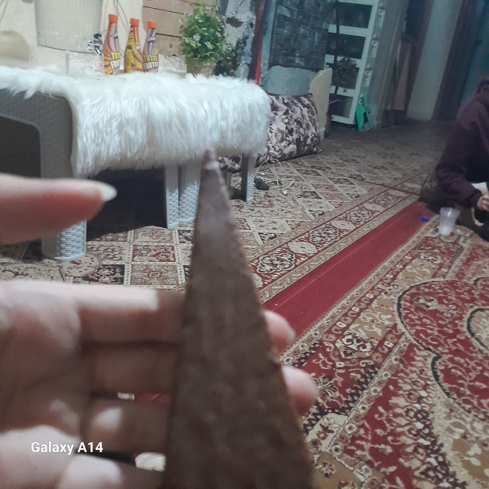 The scene is an indoor shot with a busy background. In the foreground, a person holds a brown, pointed object. The middle ground contains a white, furry seat or cushion atop a light-colored plastic ch…read more