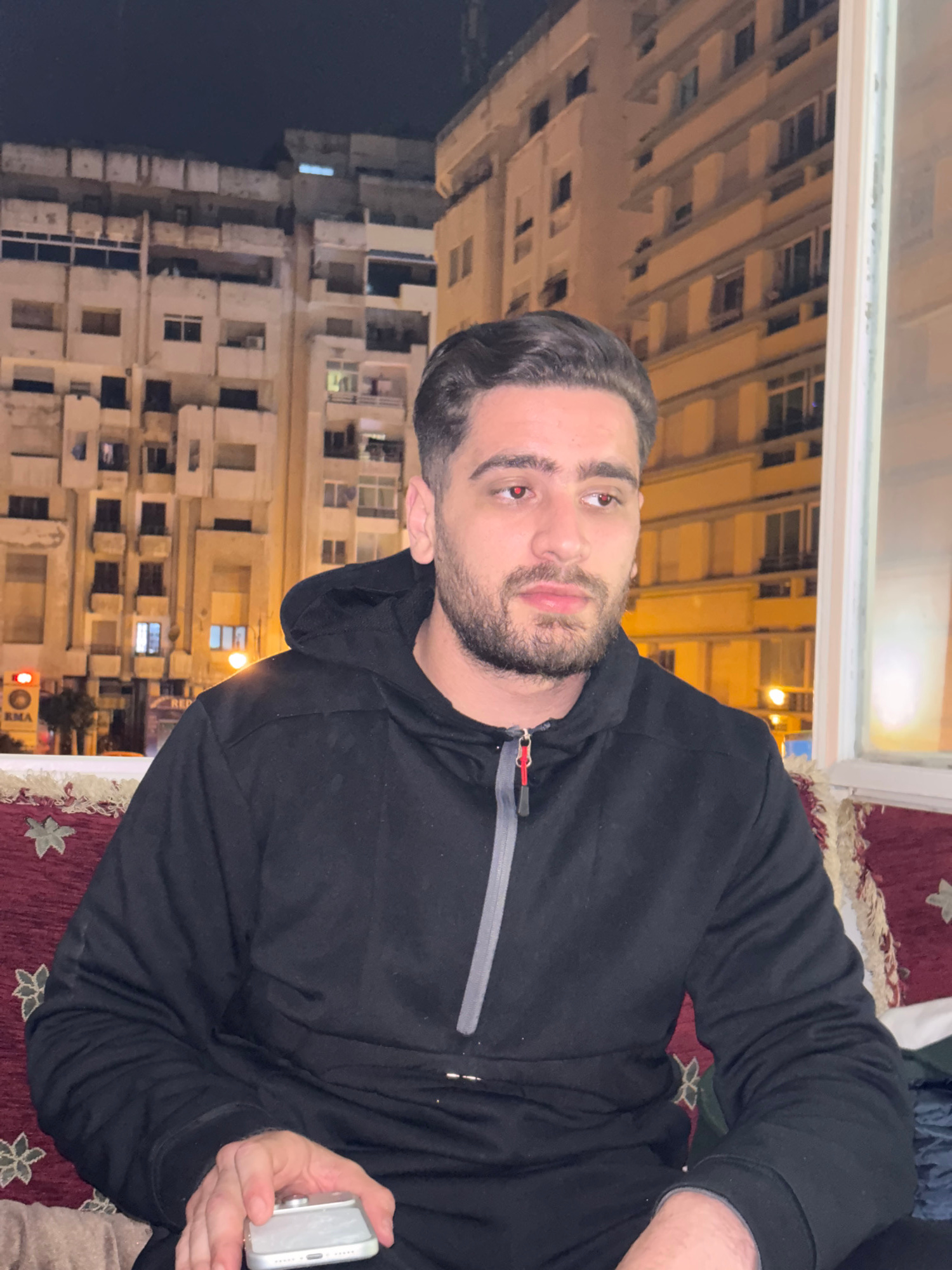 A man with dark hair and a beard is indoors, wearing a black hoodie. He is holding a white smartphone in his right hand. Through a window, buildings are visible, suggesting he is in the city of Tanger…read more