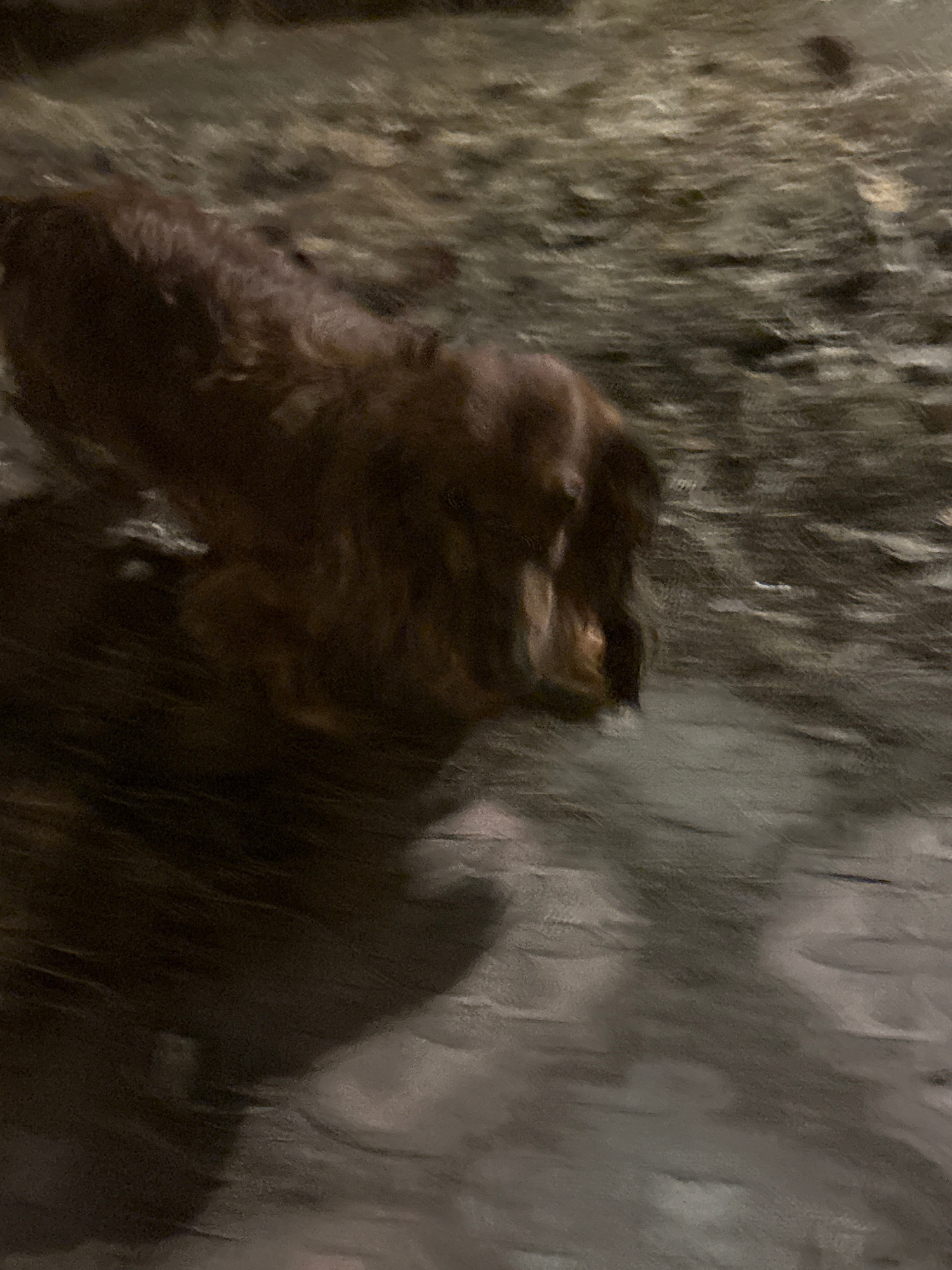 This media file presents a highly blurred and dark image, likely captured in very low light conditions. The primary subject is a dark, furry animal, possibly a large dog or a small bear, positioned in…read more