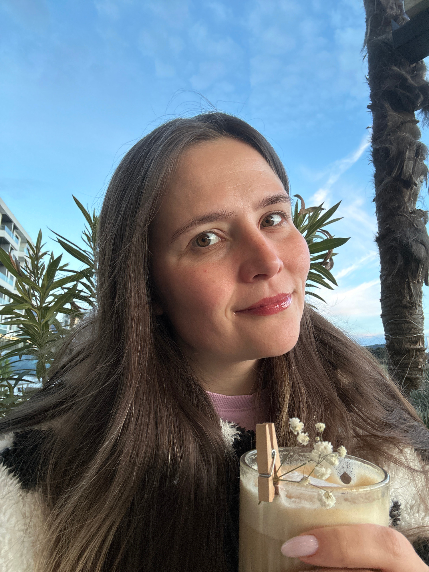 A woman is holding a drink outdoors against a blue sky with scattered clouds. A palm tree is visible above her head. The woman has long brown hair, fair skin, and hazel eyes. She is wearing a pink top…read more