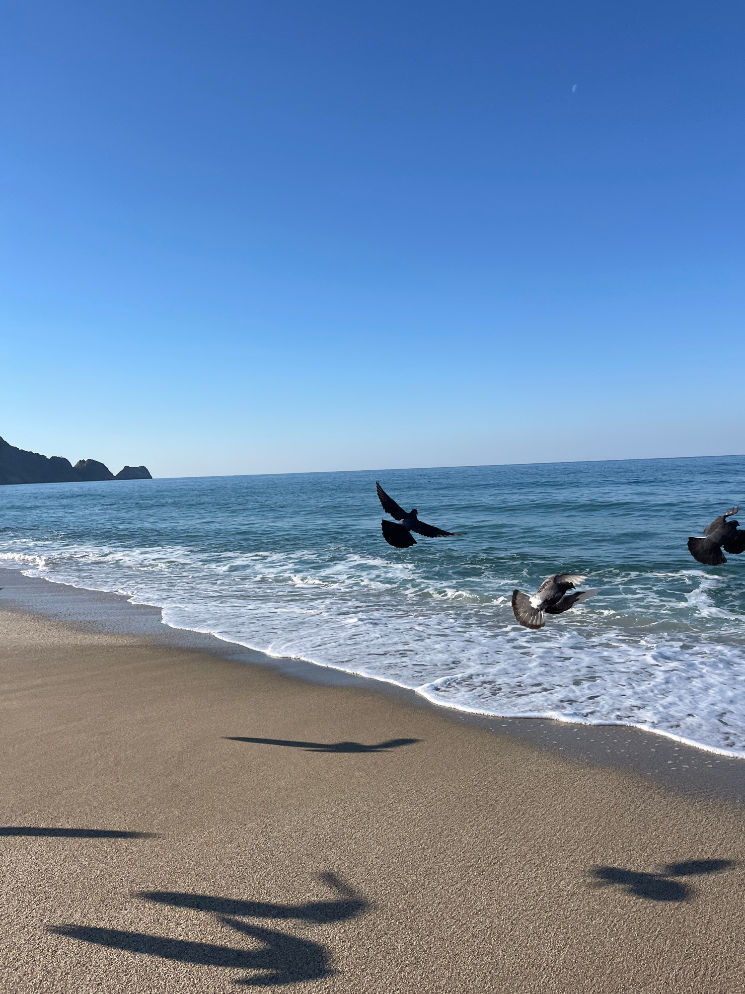The image captures a beach scene in Alanya, Turkey. The camera is oriented vertically, with the blue sky occupying the left side of the frame and the beach and ocean on the right. Three dark birds are…read more