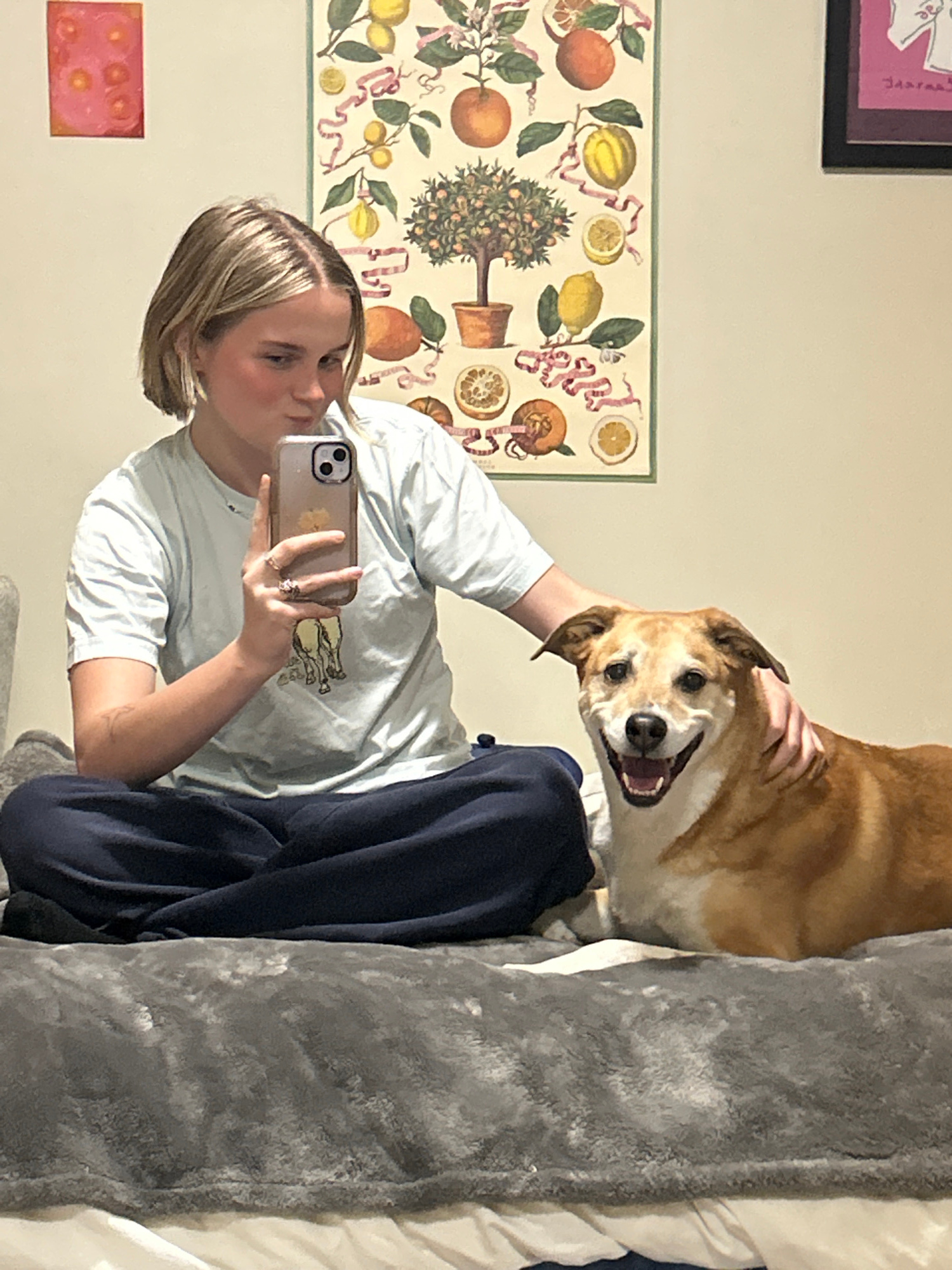 A fair-skinned person with short, blonde hair is sitting on what appears to be a bed, wearing a light blue t-shirt and dark blue pants. The person is holding a cell phone with a light-colored case and…read more