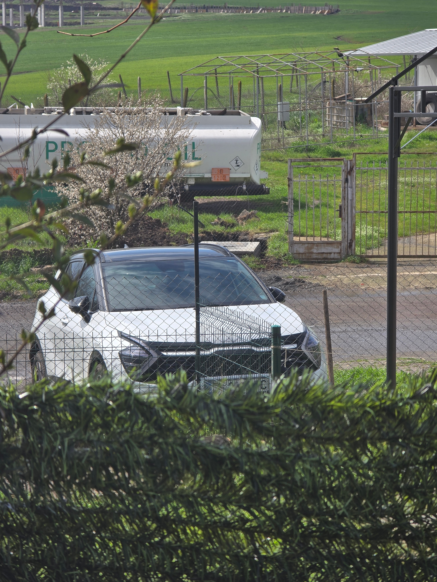 The image shows a white car parked near a fence and gate, with green vegetation and a tank in the background. The scene appears to be in a rural or semi-rural area, and the location in Burgas, Bulgari…read more