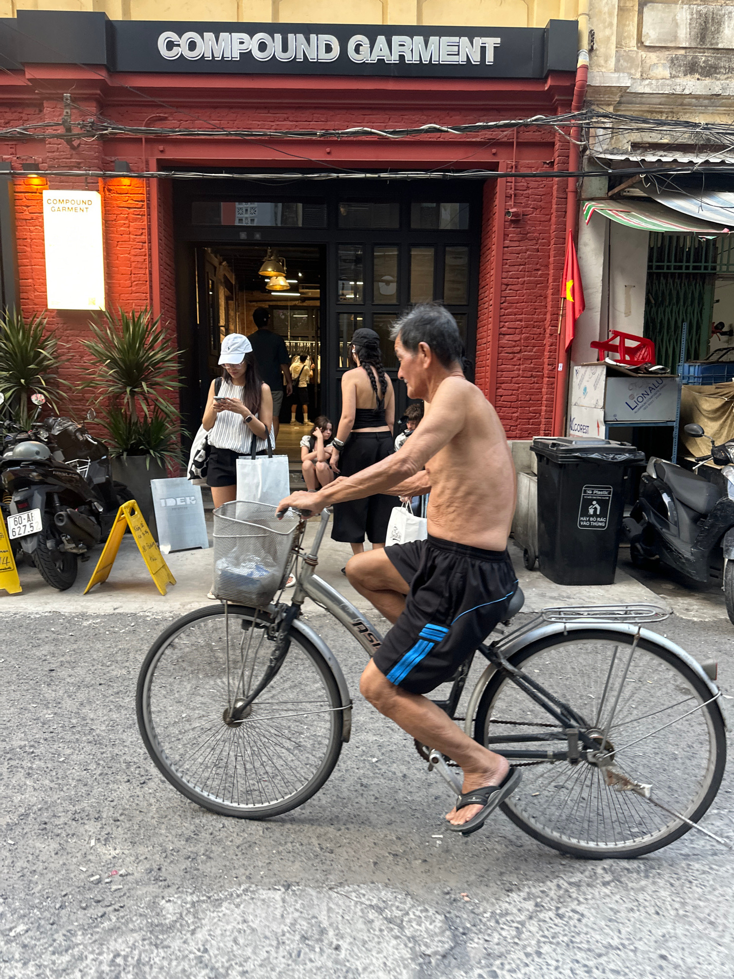 This image depicts a bustling urban street scene in what is understood to be the city of Thủ Đức, Vietnam, featuring a man cycling past a storefront. In the foreground, an elderly man, shirtless with…read more