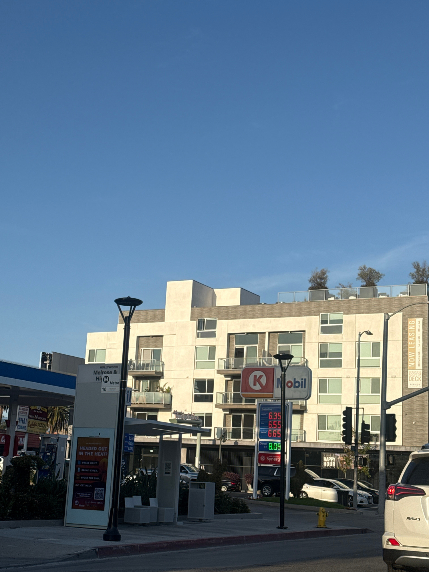 The image captures a sunlit street scene, likely in an urban area, depicting a multi-story building, a gas station, and a clear blue sky. The photo is rotated 90 degrees clockwise, showing the sky on…read more