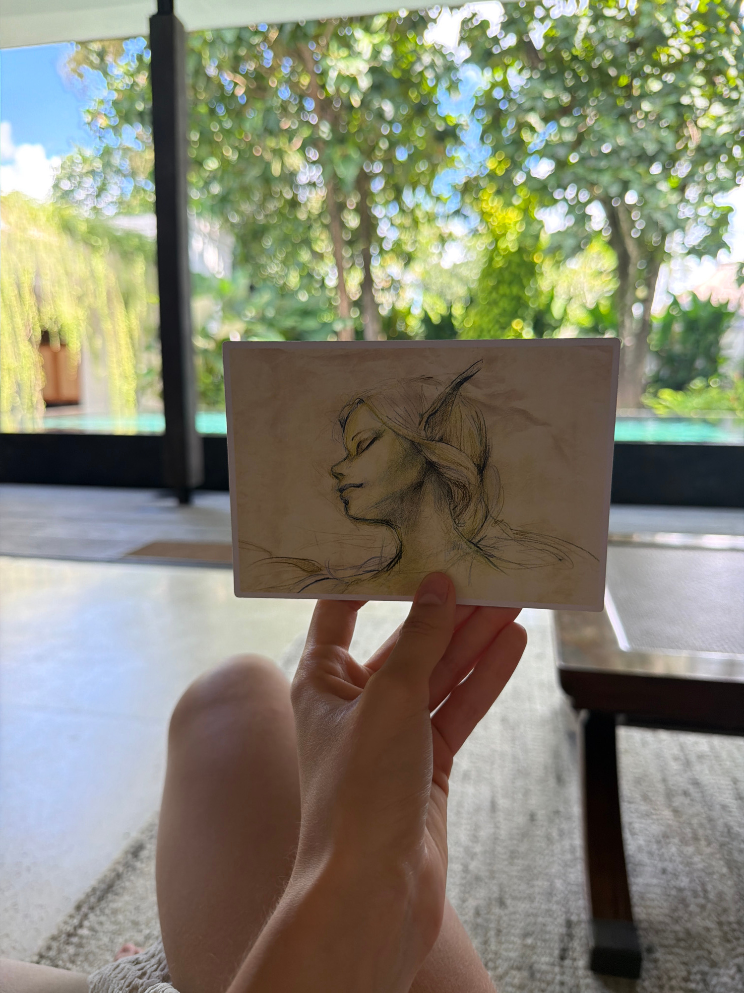 A person is holding a drawing of an elf in their right hand. The drawing is on a small, rectangular piece of paper with slightly rounded corners, depicting a profile of a character with pointed ears a…read more