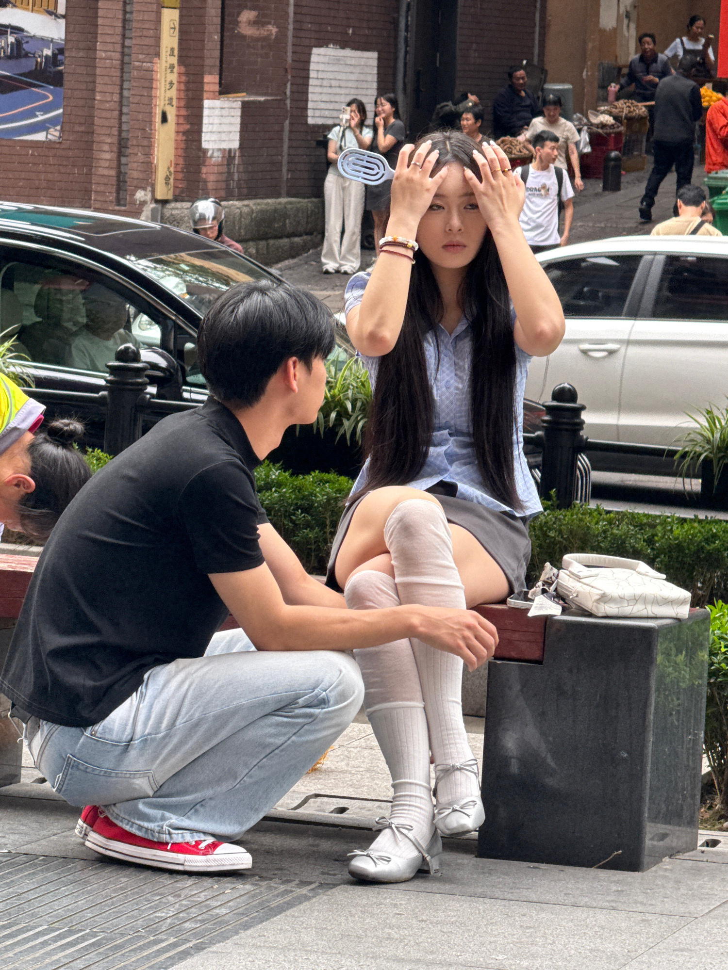 A photograph captures a scene on a Yuzhong District, China sidewalk, where a man in a black t-shirt and light blue jeans kneels before a woman seated on a black cube. She wears a light blue striped sh…read more