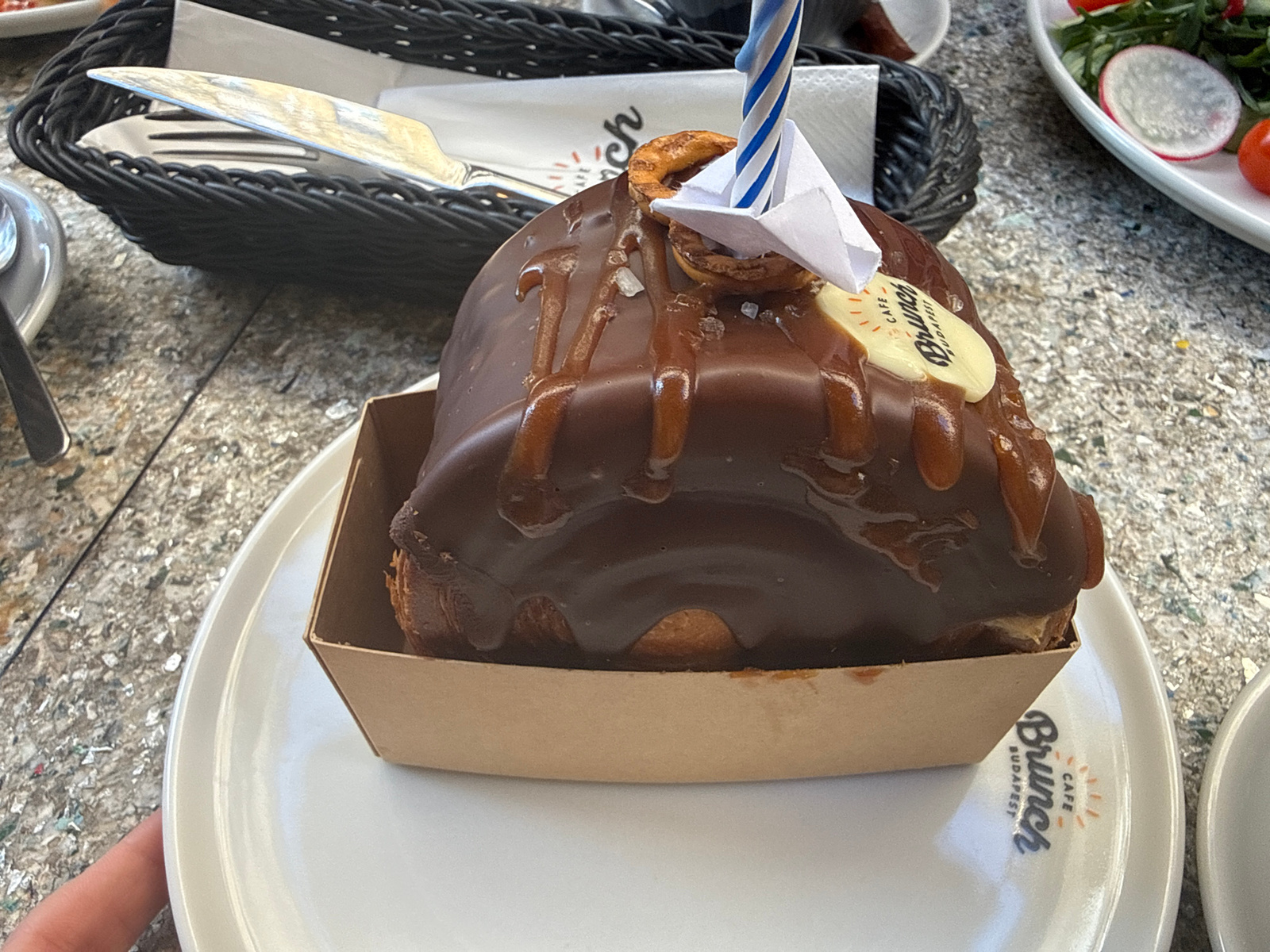 The image presents a close-up view of a decadent chocolate-covered pastry, likely a large croissant or cake, set on a white ceramic plate. The pastry is generously coated in dark chocolate icing withβ¦read more
