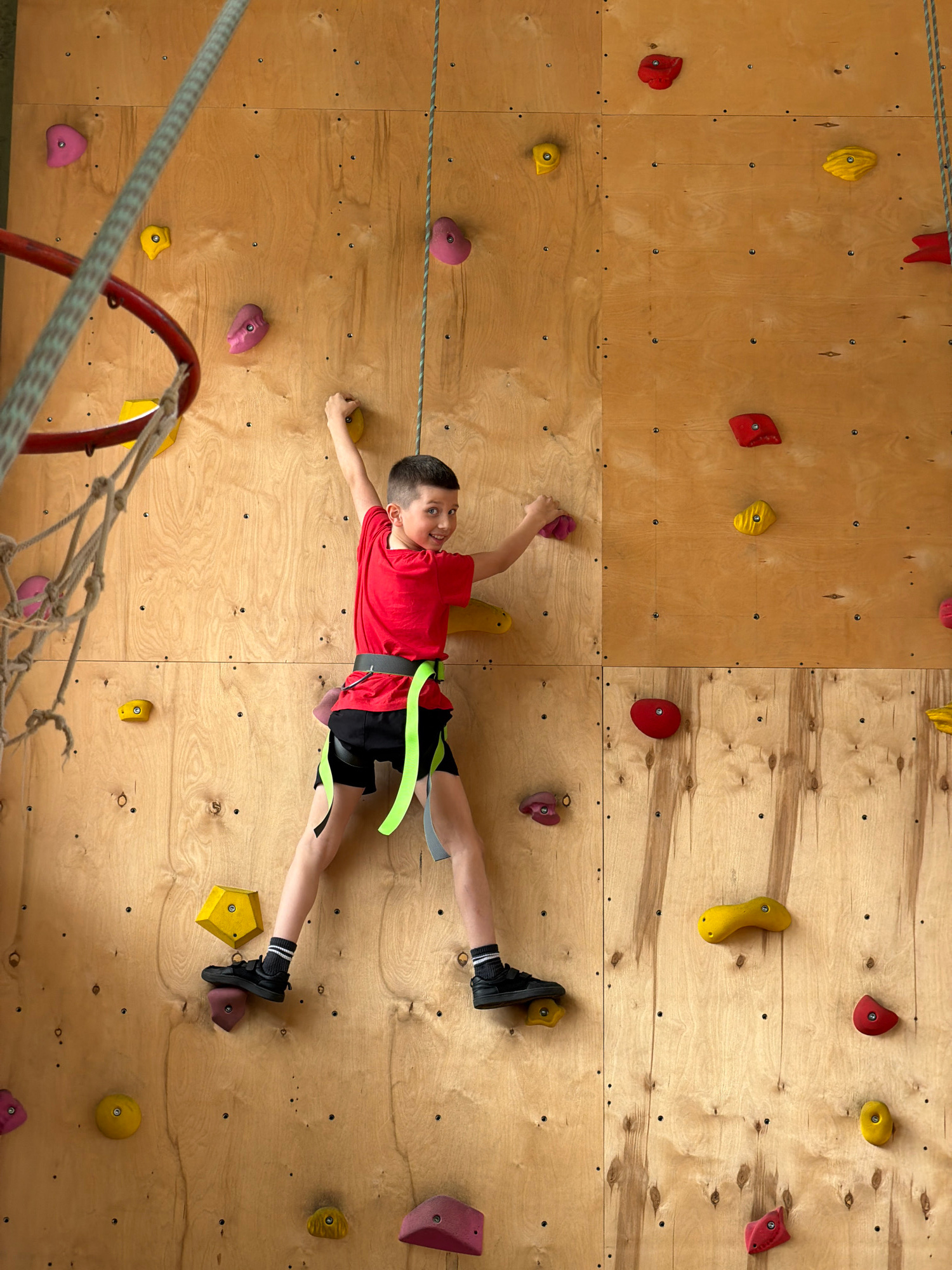 A boy is rock climbing indoors on a wooden wall with colorful handholds and footholds. He is wearing a red t-shirt, black shorts with green accents, and climbing shoes. He is using a climbing harnessβ¦read more
