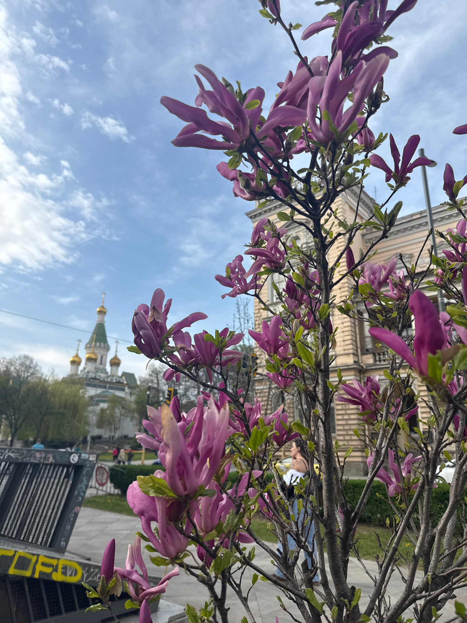 The image captures a springtime urban scene in Sofia, Bulgaria, viewed upwards through the branches of a blooming tree. In the immediate foreground, numerous clusters of pink and purple magnolia-like…read more