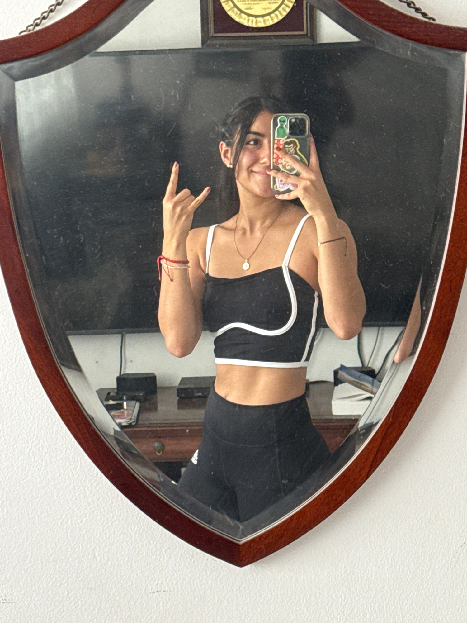 A young woman is visible in a mirror. The mirror has a wooden frame, a silver trim, and is mounted on a white wall. The woman is wearing a black and white sports top and black leggings. She is holding…read more