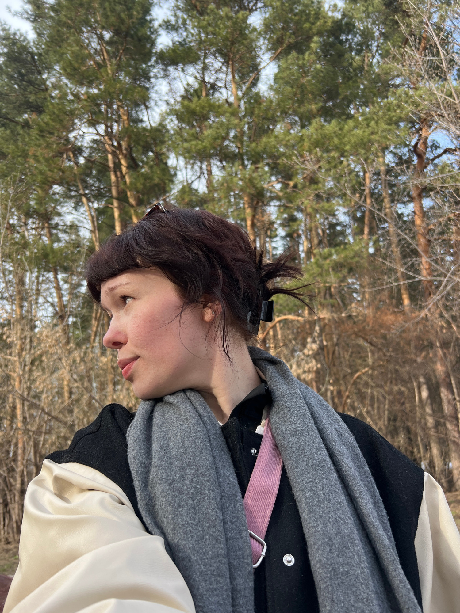 A young woman with brown hair pulled back by a black clip is looking down in a forested area. She is wearing a black and white jacket and a gray scarf. A pink strap is visible under the scarf. The bac…read more