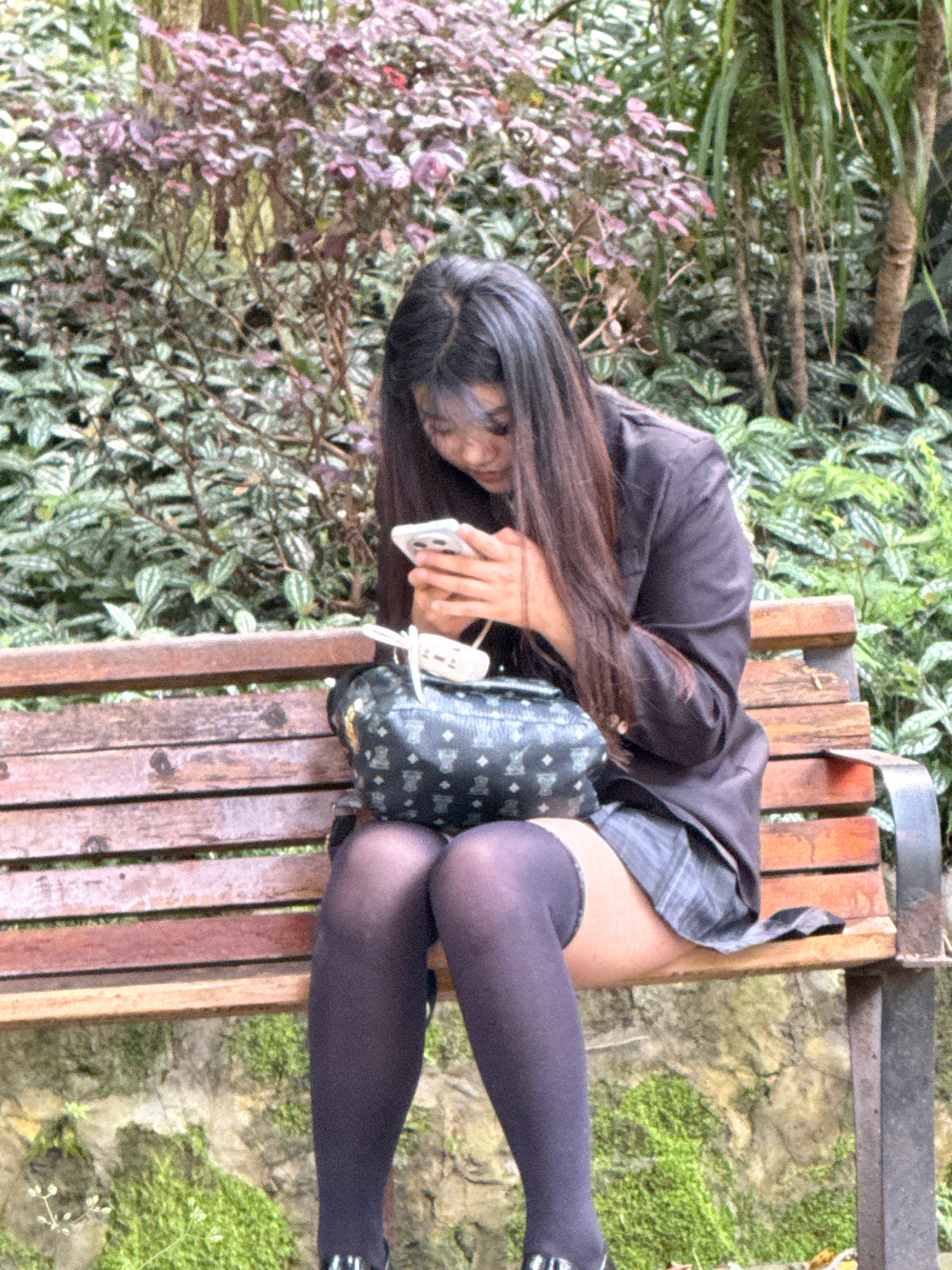 A young woman wearing a black blazer, plaid skirt, dark stockings, and studded black shoes is seated on a wooden bench in what appears to be a park or garden setting. She is holding a cell phone in he…read more