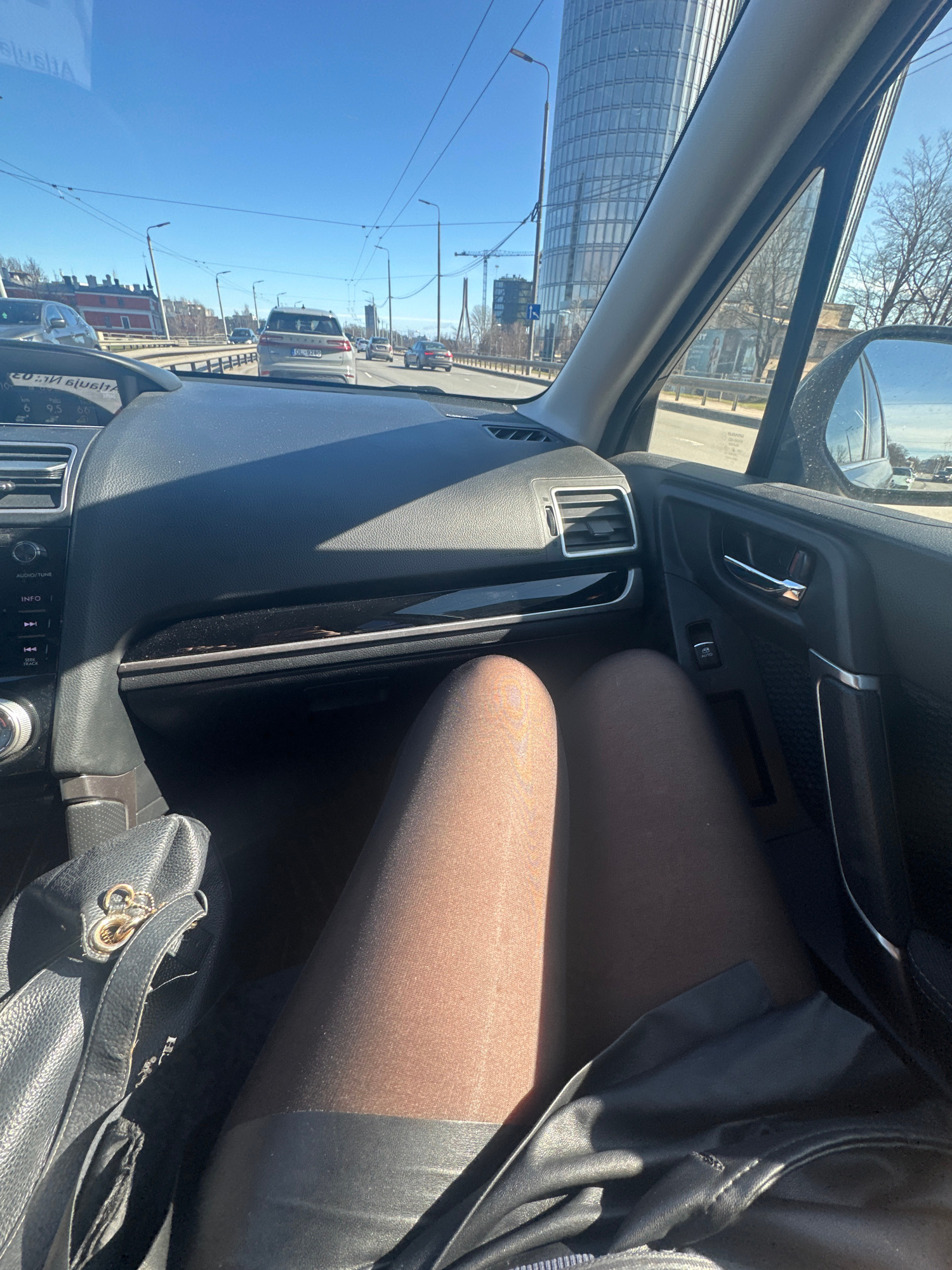 The image, taken from inside a car, shows a view of a Riga, Latvia street on a clear, sunny day. The dashboard and front interior of the vehicle fill the foreground, with a partial view of the driver'…read more