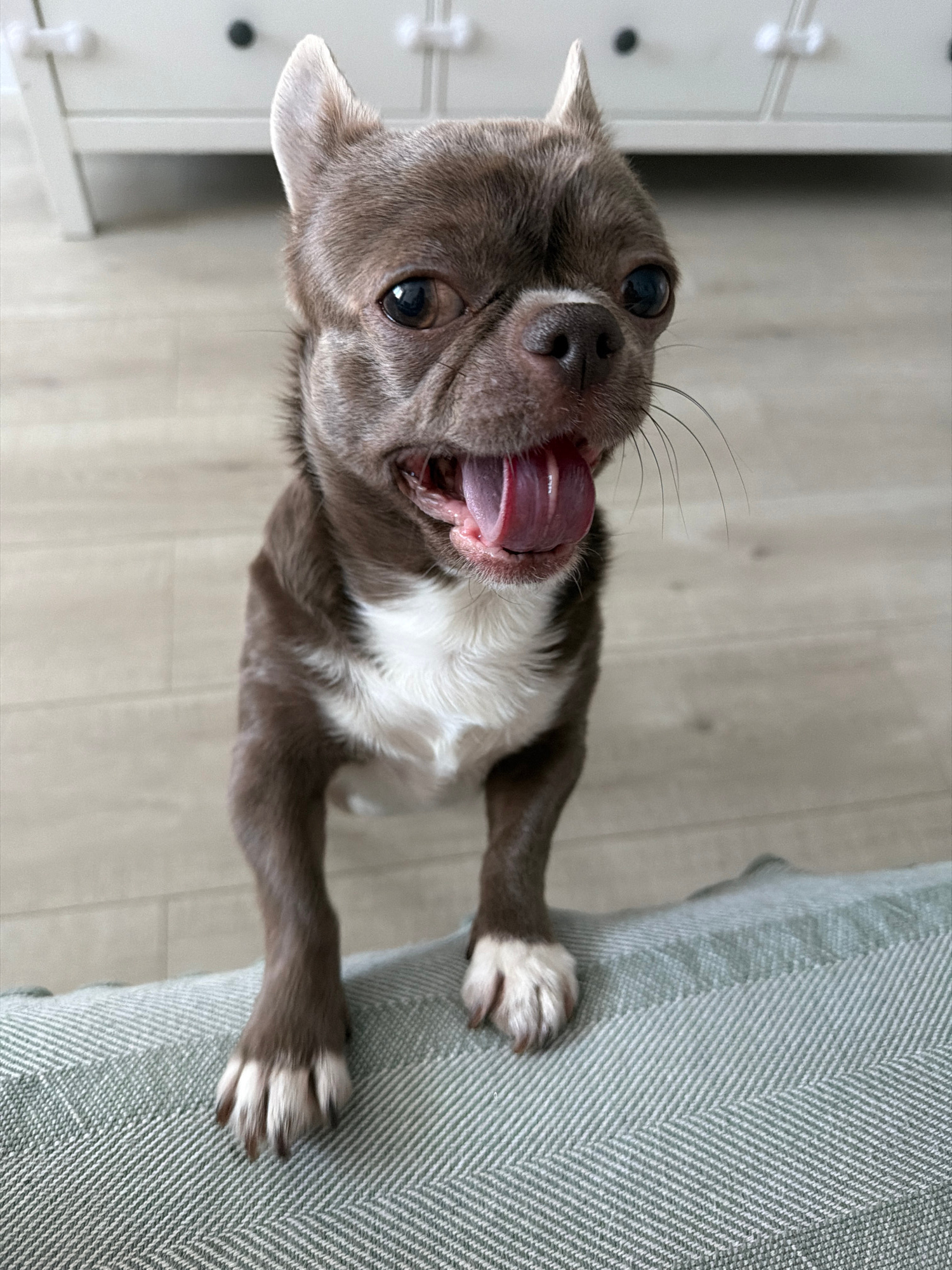 A tilted, medium-shot photograph shows a small dog, possibly a chihuahua mix, with a light gray and white coat, standing on its hind legs against a gray-green textured couch. The dog's tongue is exten…read more