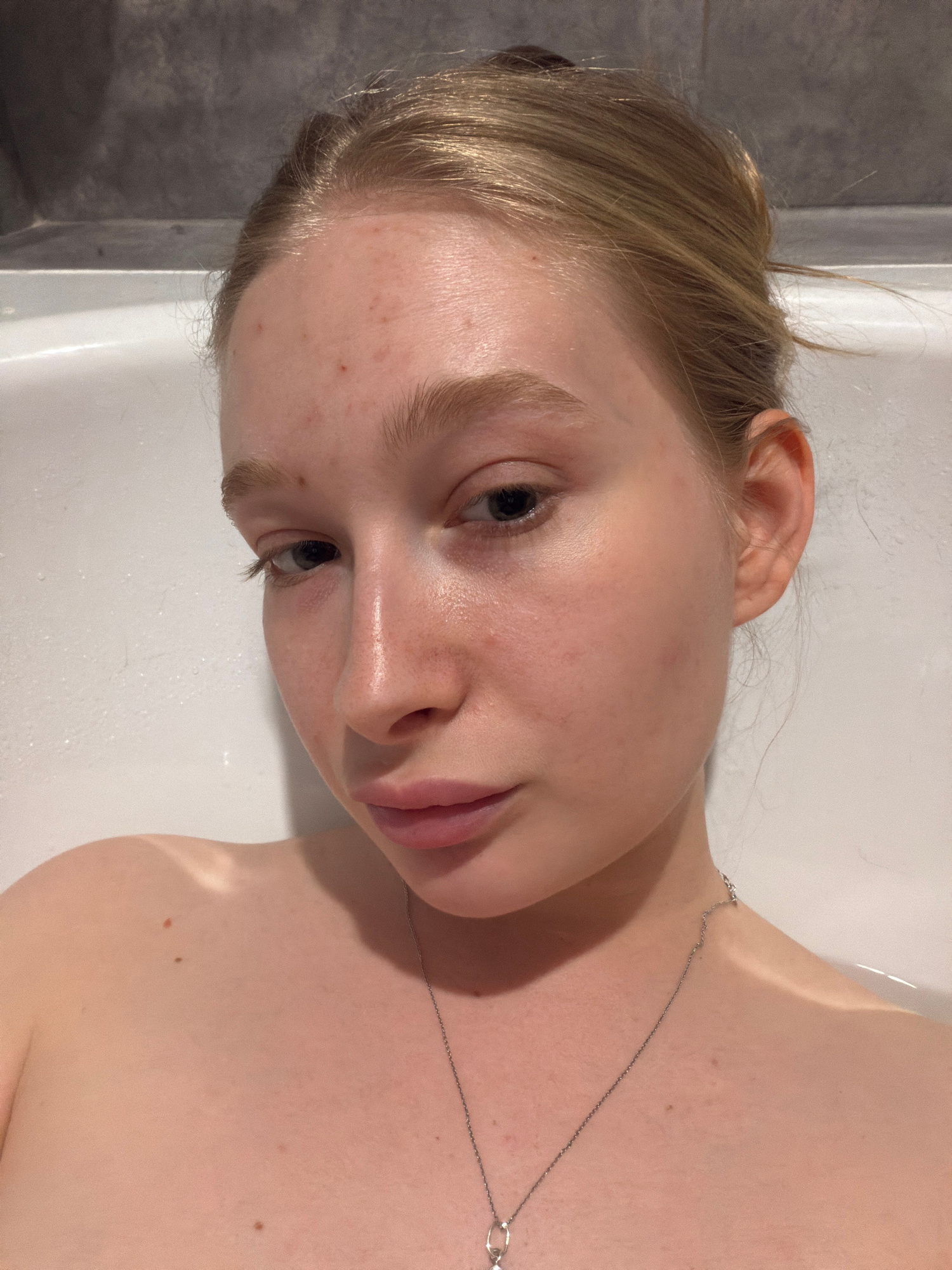 The media file presents a portrait-style image of a young person, likely female, from the chest up, positioned within a bathtub. The subject has fair skin, light blonde or light brown hair tied back,…read more