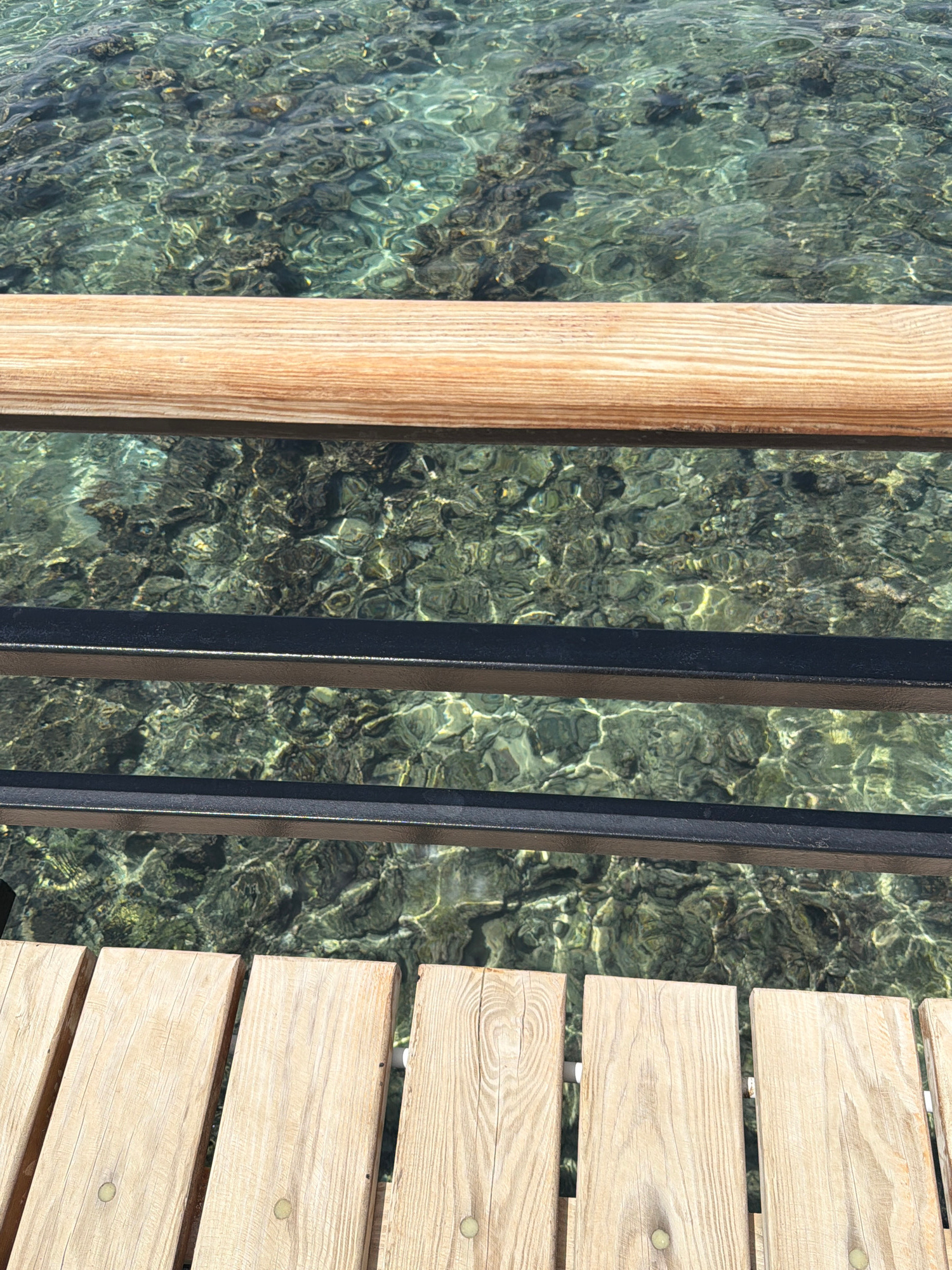 A high-angle close-up shot shows a section of a wooden dock in Sharm El Sheikh, Egypt, juxtaposed with the clear, shallow waters of the Red Sea. The wooden dock is constructed with light-colored plank…read more