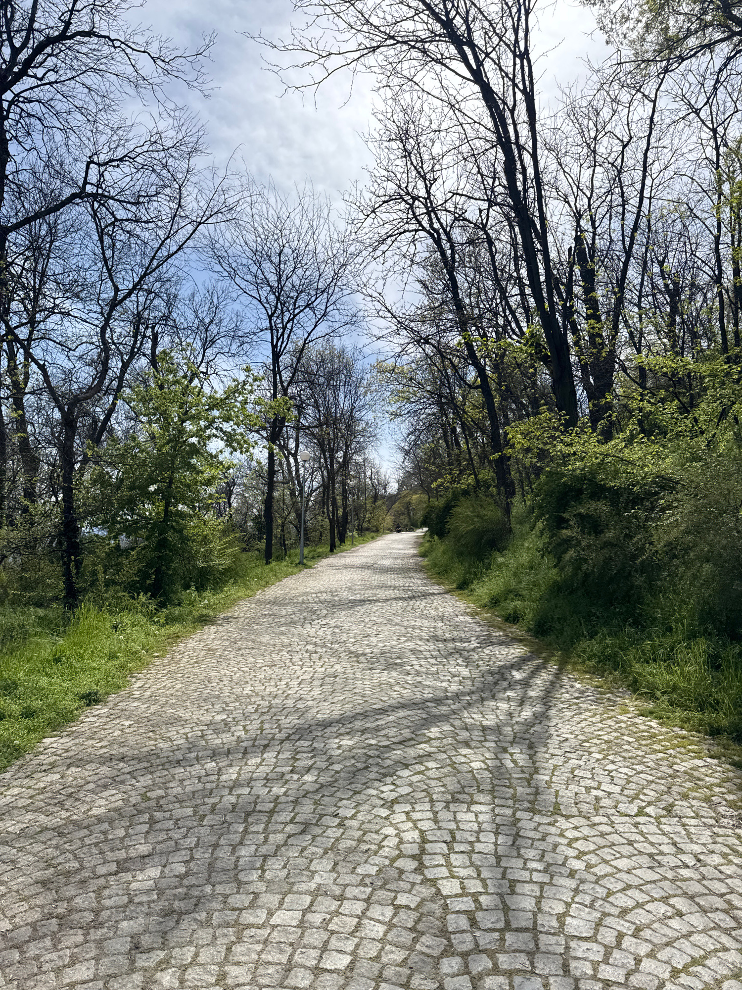 The image captures a serene outdoor scene featuring a cobblestone path flanked by trees and grass, extending into the distance under a bright sky. The path is paved with numerous small, grey, irregulaβ¦read more
