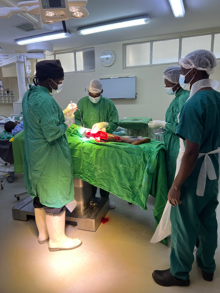The scene depicts an active surgical procedure occurring within an operating room in a medical facility in Nairobi, Kenya. Four individuals, all wearing green surgical scrubs, face masks, and protecti…read more