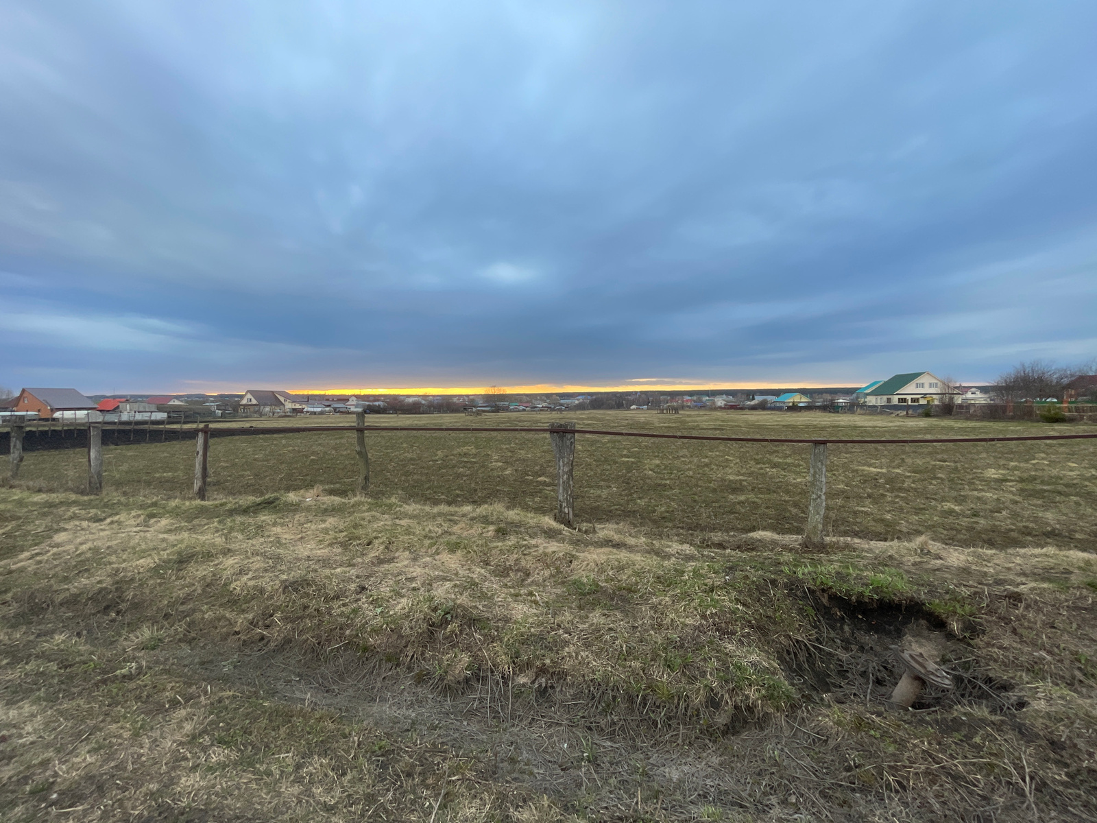 The image shows a rural landscape in Новая Шемурша, Russia, under a cloudy sky with a hint of sunset on the horizon. In the foreground is a ditch with dry grass and bare earth. Beyond the ditch, there…read more