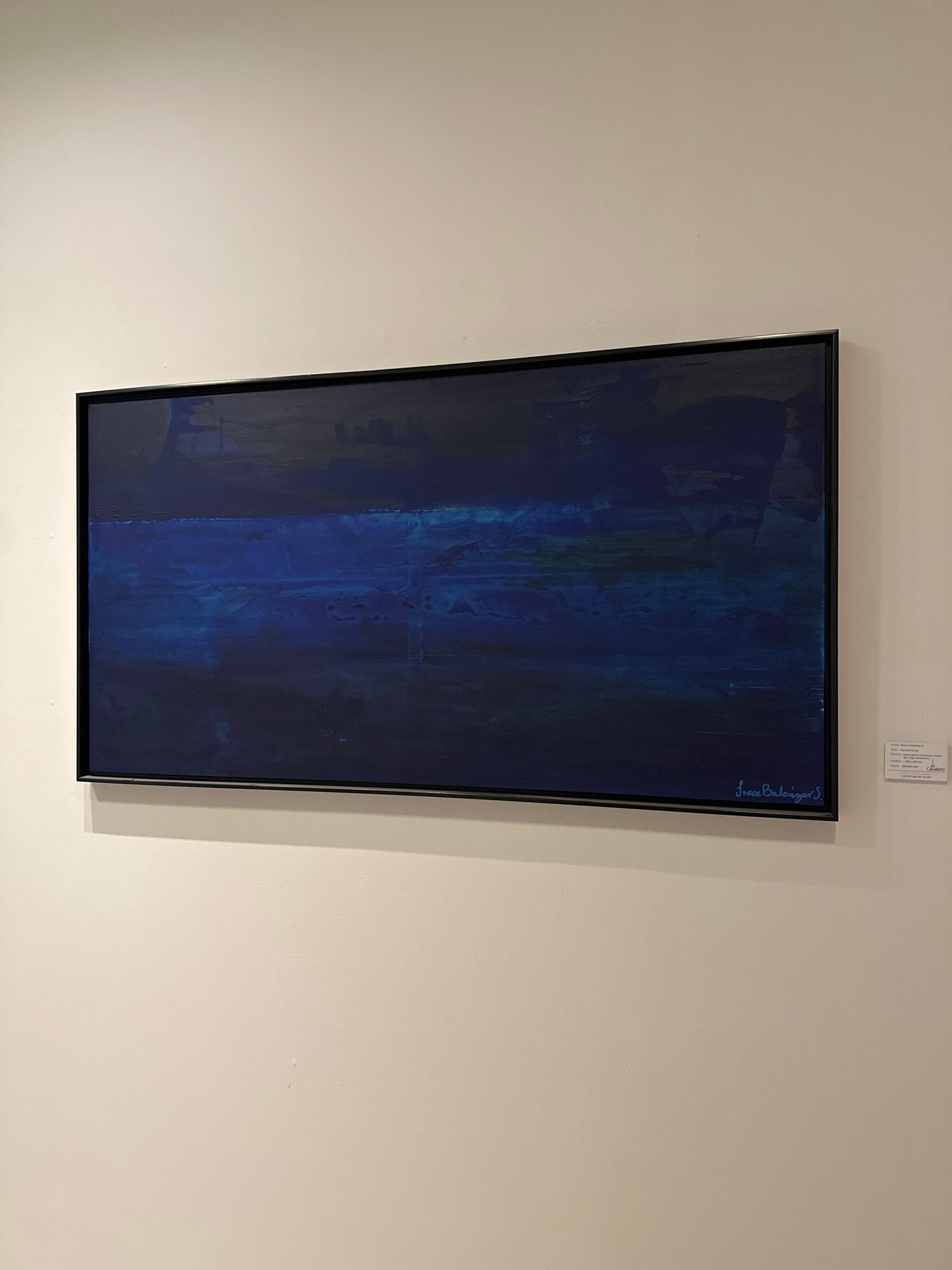 An abstract painting with blue tones hangs on a light-colored wall in an indoor setting. The painting is framed in black and features vertical bands of dark and light blue, creating a sense of depth.…read more