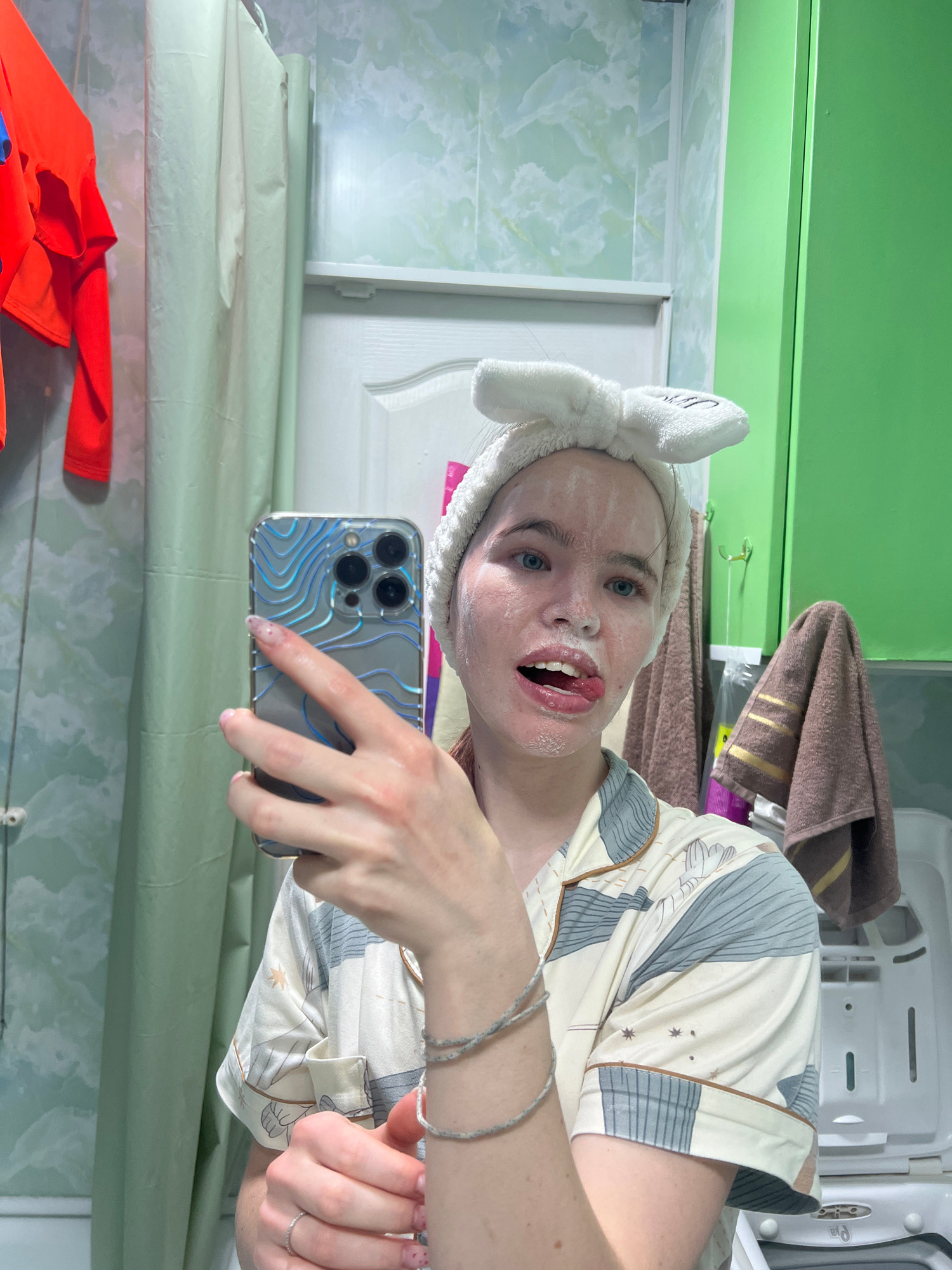 A selfie captures a young person, likely female, in a bathroom, engaged in a skincare routine. Their face is covered in a white, foamy substance, and they wear a white, fluffy bunny-ear headband. They…read more