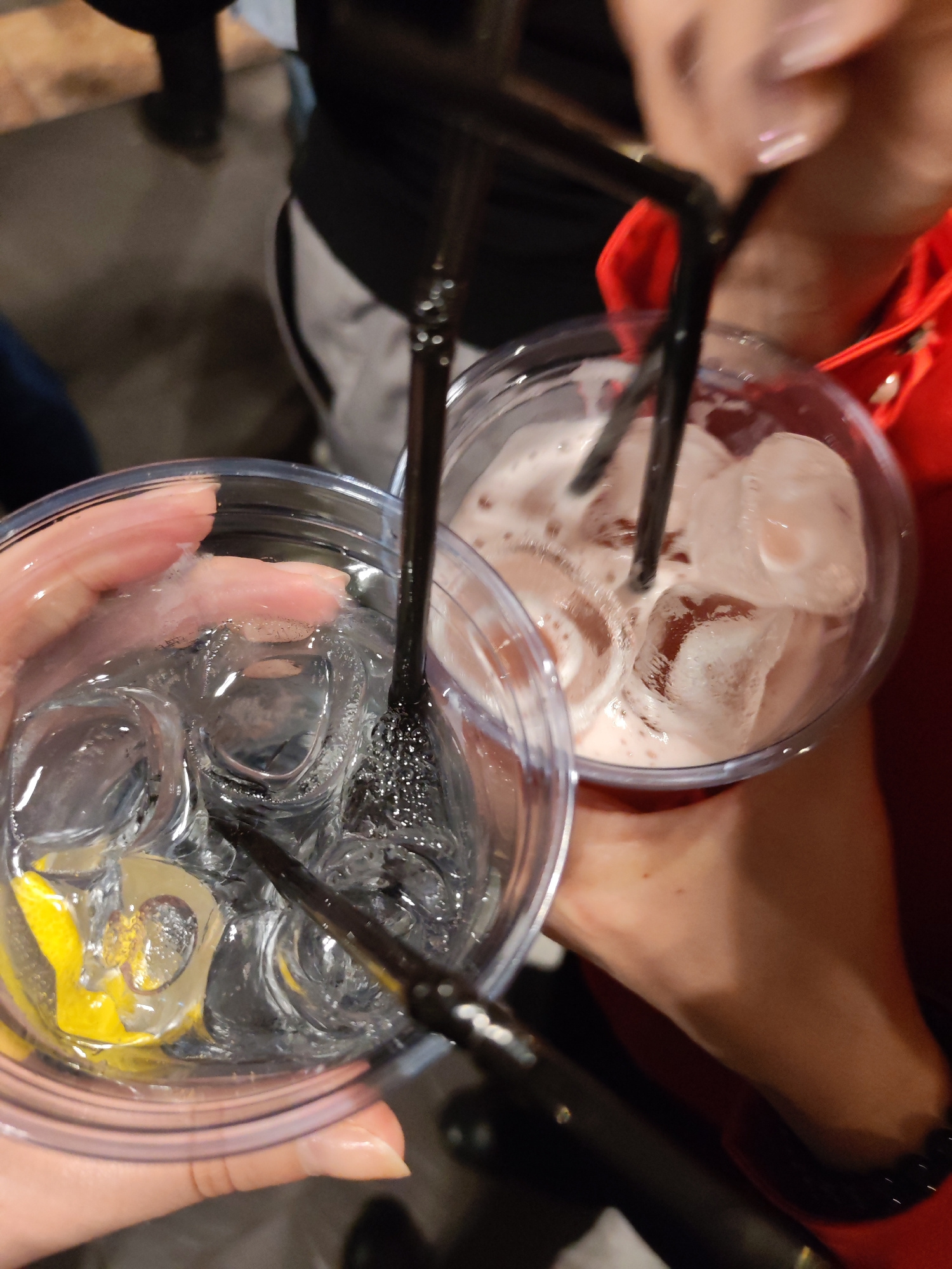 Two people are shown holding plastic cups with drinks, viewed from a close-up, top-down perspective, suggesting a social gathering. In the foreground and to the left, a person with fair skin and ligh…read more