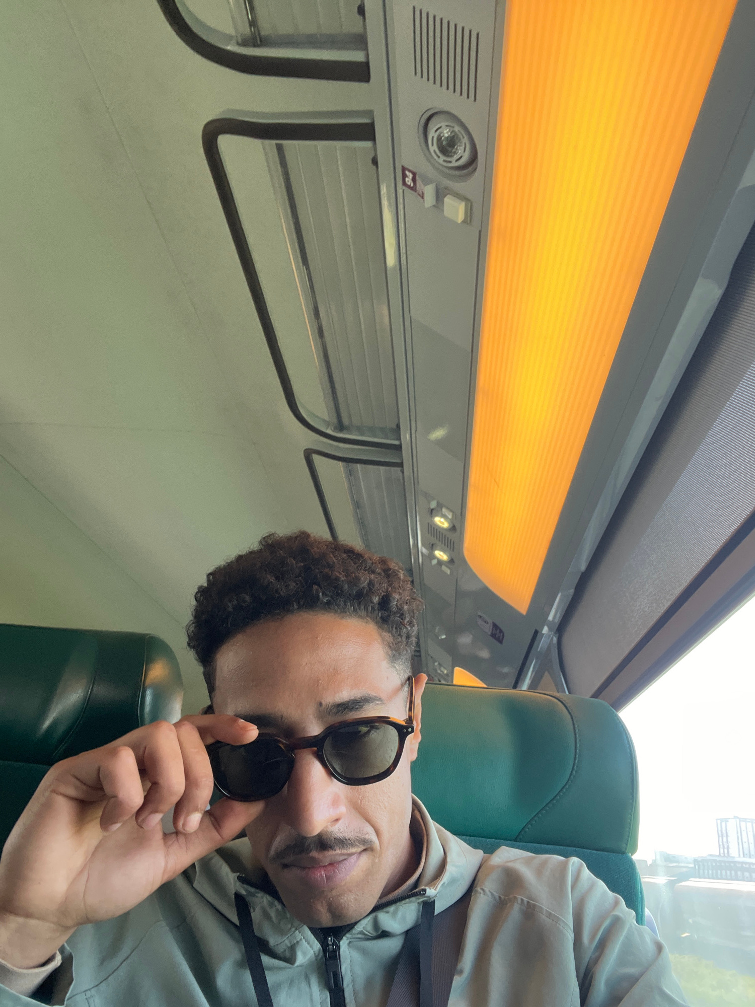 An adult male is depicted in a selfie taken inside a modern passenger train, indicating transit through the city of Kenitra, Morocco. The subject, positioned centrally, has dark curly hair, a mustacheβ¦read more