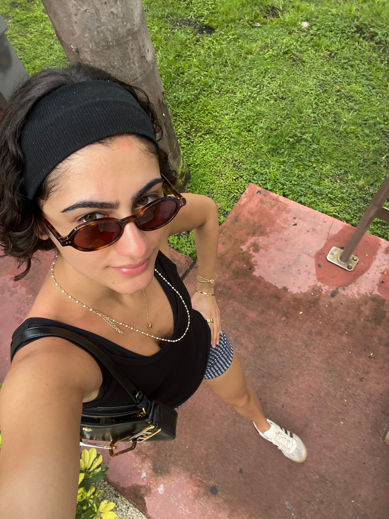 A person is holding the camera and taking a selfie. The person in the image is wearing a black tank top, a black headband, sunglasses, a gold necklace, and a black handbag. They are standing on a red…read more