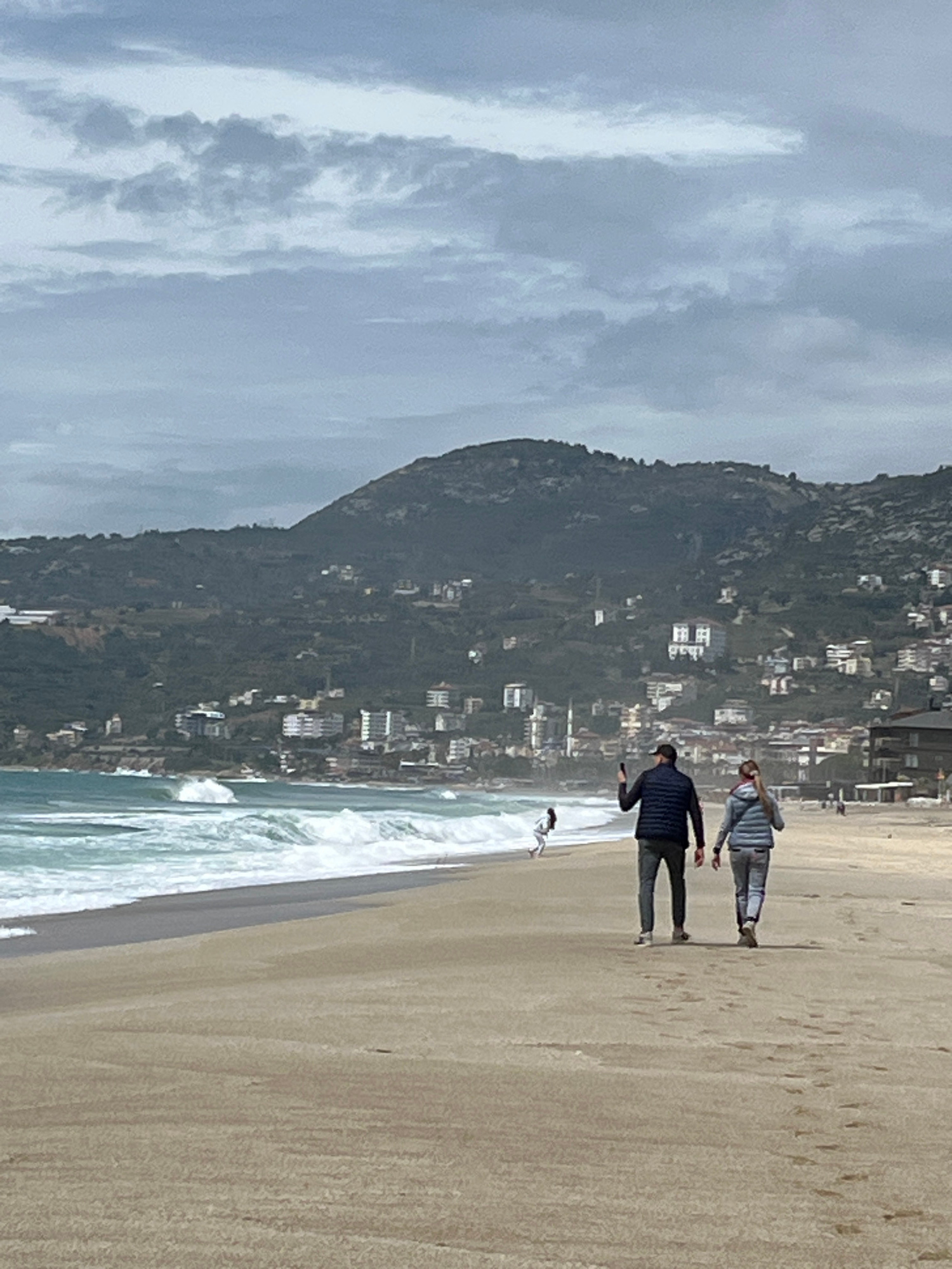 The image captures a scene at Kleopatra Beach in Alanya, Turkey. The photograph is oriented vertically, depicting a wide sandy beach bordered by the turquoise sea. Several people are visible on the be…read more
