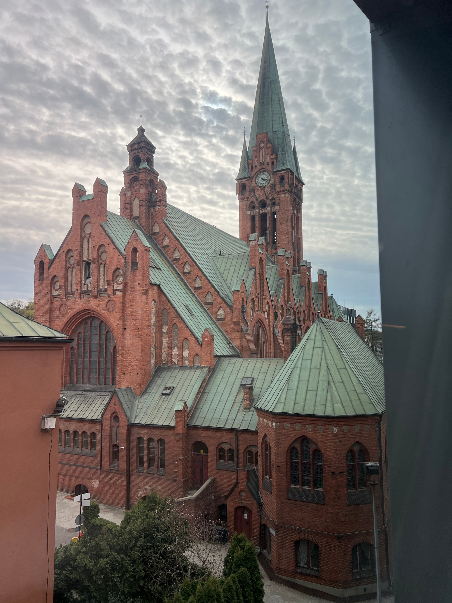 The image shows the Roman Catholic Church of the Holy Trinity in Bydgoszcz, Poland, viewed from an elevated position through a window frame. The architectural style is neo-Gothic, with red brick walls…read more