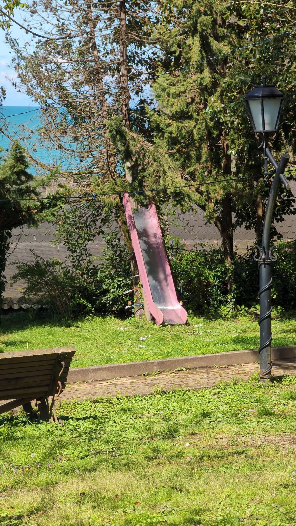 A view of a park in Batumi, Georgia. A pink slide is situated between greenery and trees. A lamppost is nearby, and a bench is in the lower right corner. The ground is covered with grass. A view of thβ¦read more