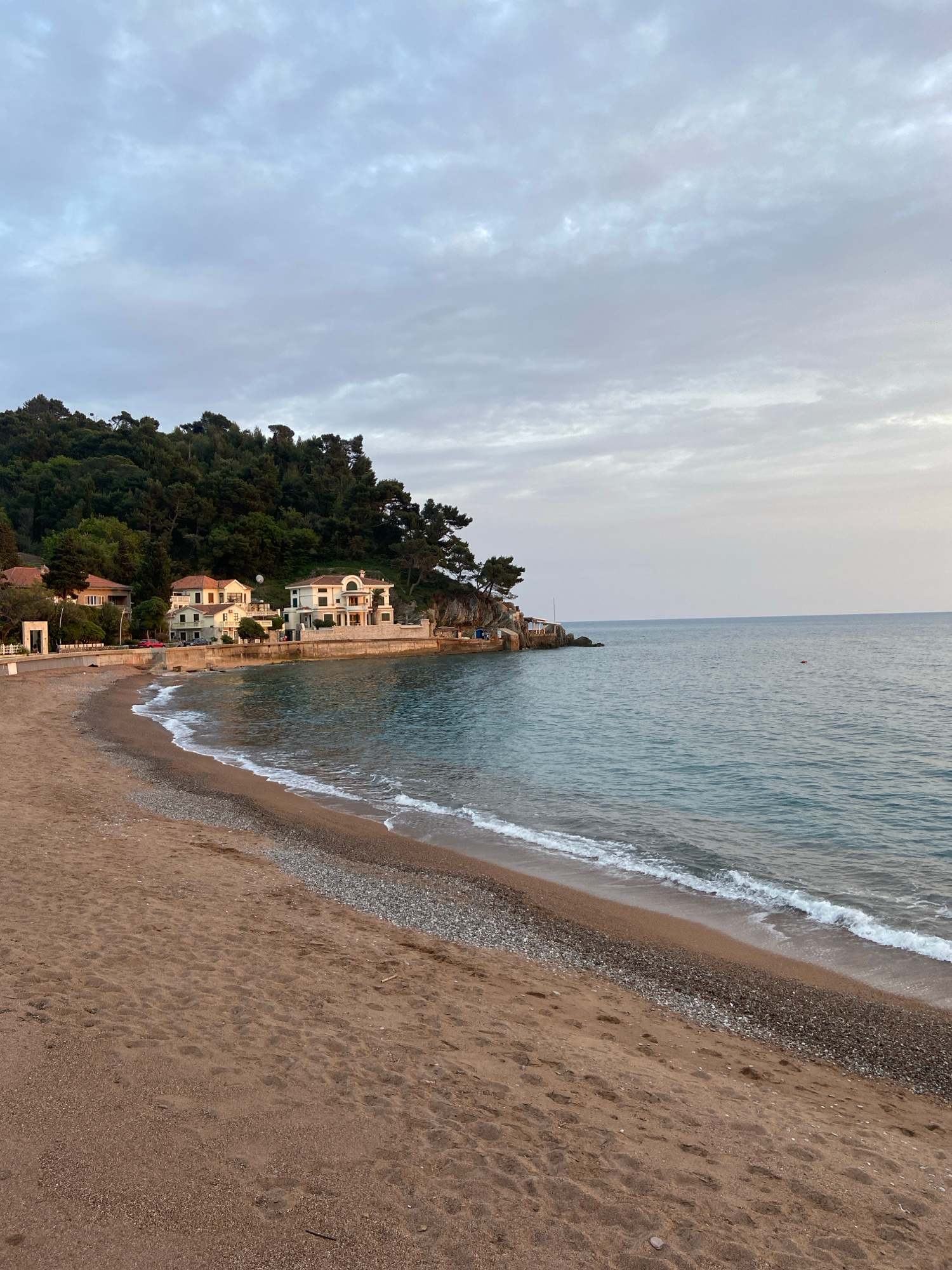 This image depicts a serene coastal landscape in Petrovac centar, Montenegro, captured from an elevated perspective looking along the coastline. The scene is dominated by a beach, the sea, a densely f…read more