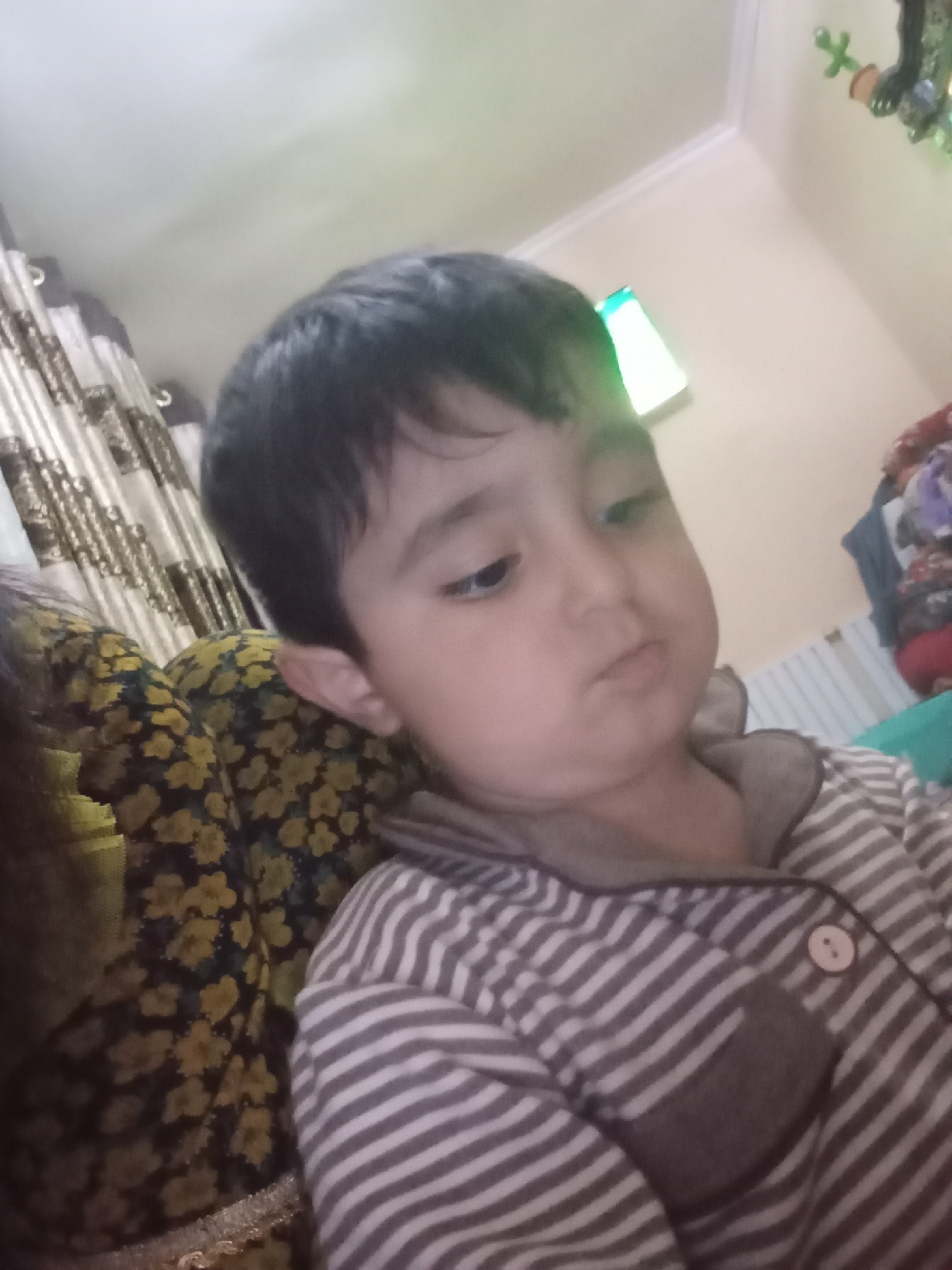 A young child with dark hair is pictured indoors. The child is wearing a gray and white striped garment and appears to be sitting next to a person wearing a dark green and yellow floral print top. The…read more