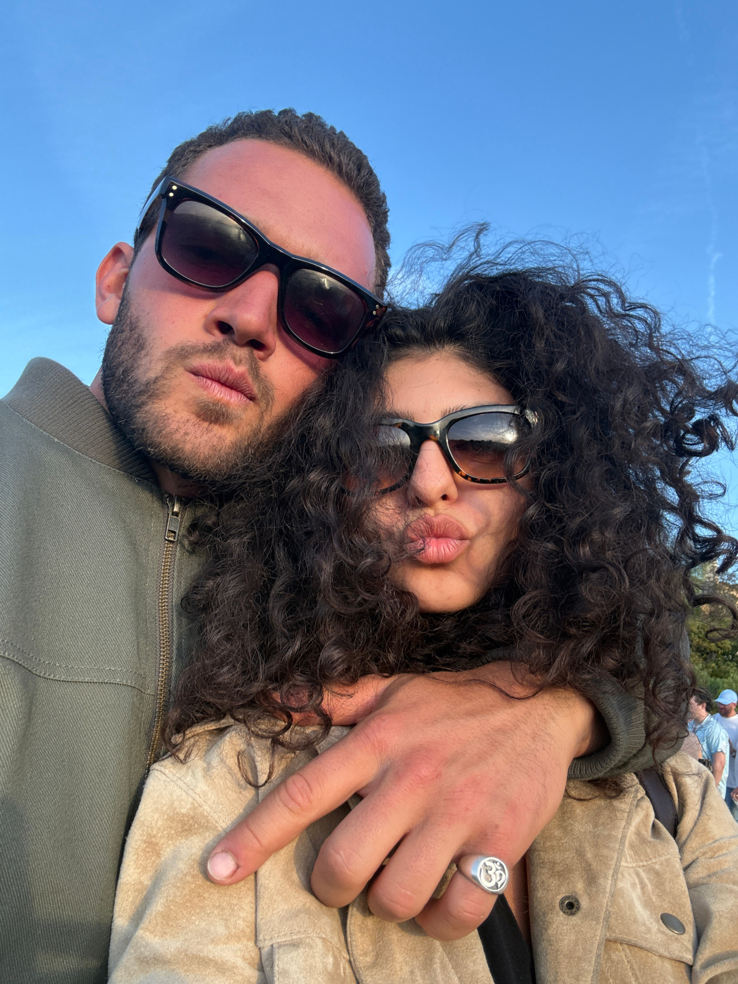 A low-angle selfie image features two individuals against a clear blue sky. The person in the foreground has short brown hair, a beard, and wears black sunglasses. The person behind has long, curly bl…read more