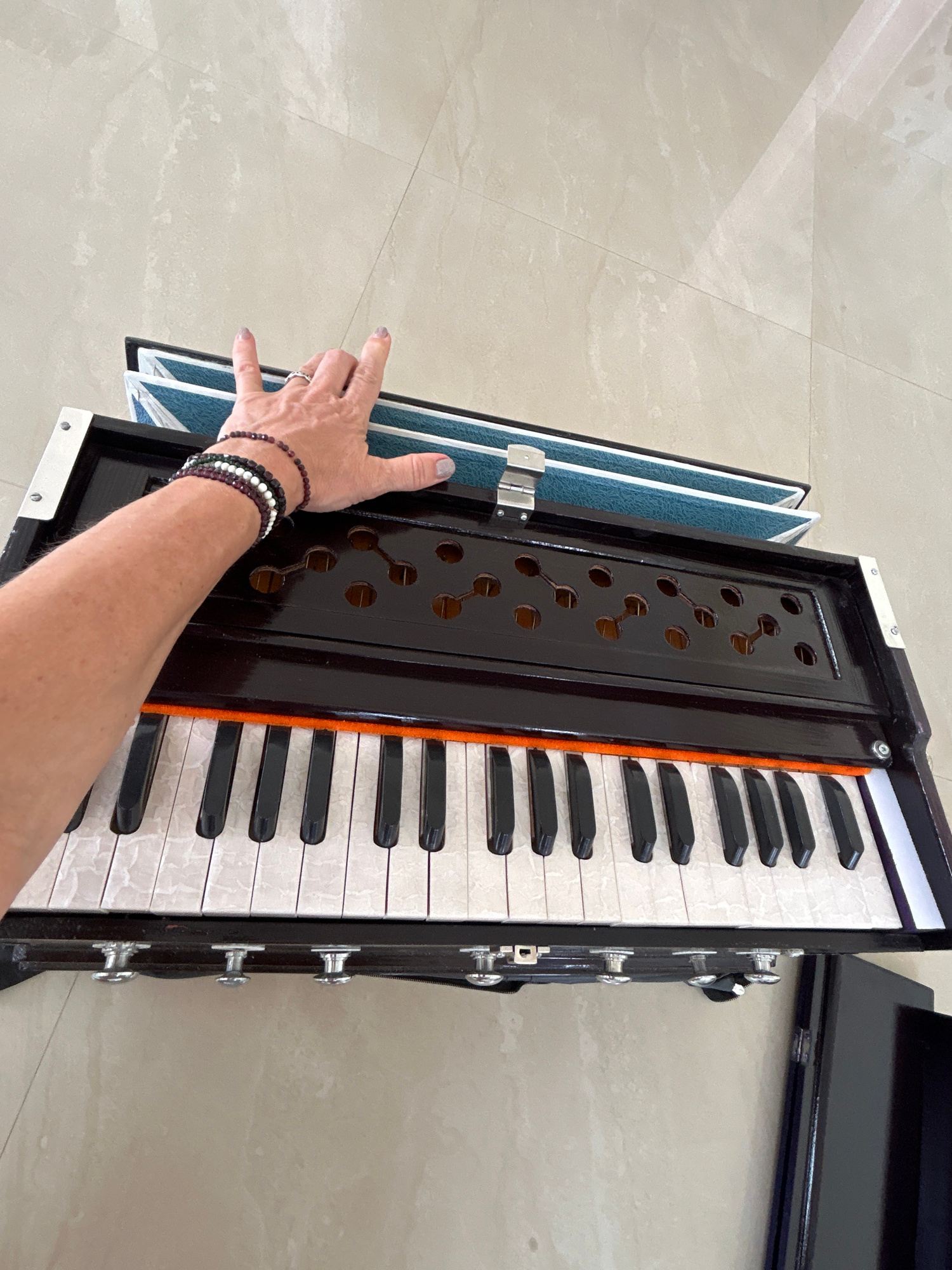 The image presents a harmonium resting on a beige tiled floor. A person's arm and hand are visible, with the hand appearing to manipulate the bellows of the instrument. The harmonium is dark-colored w…read more