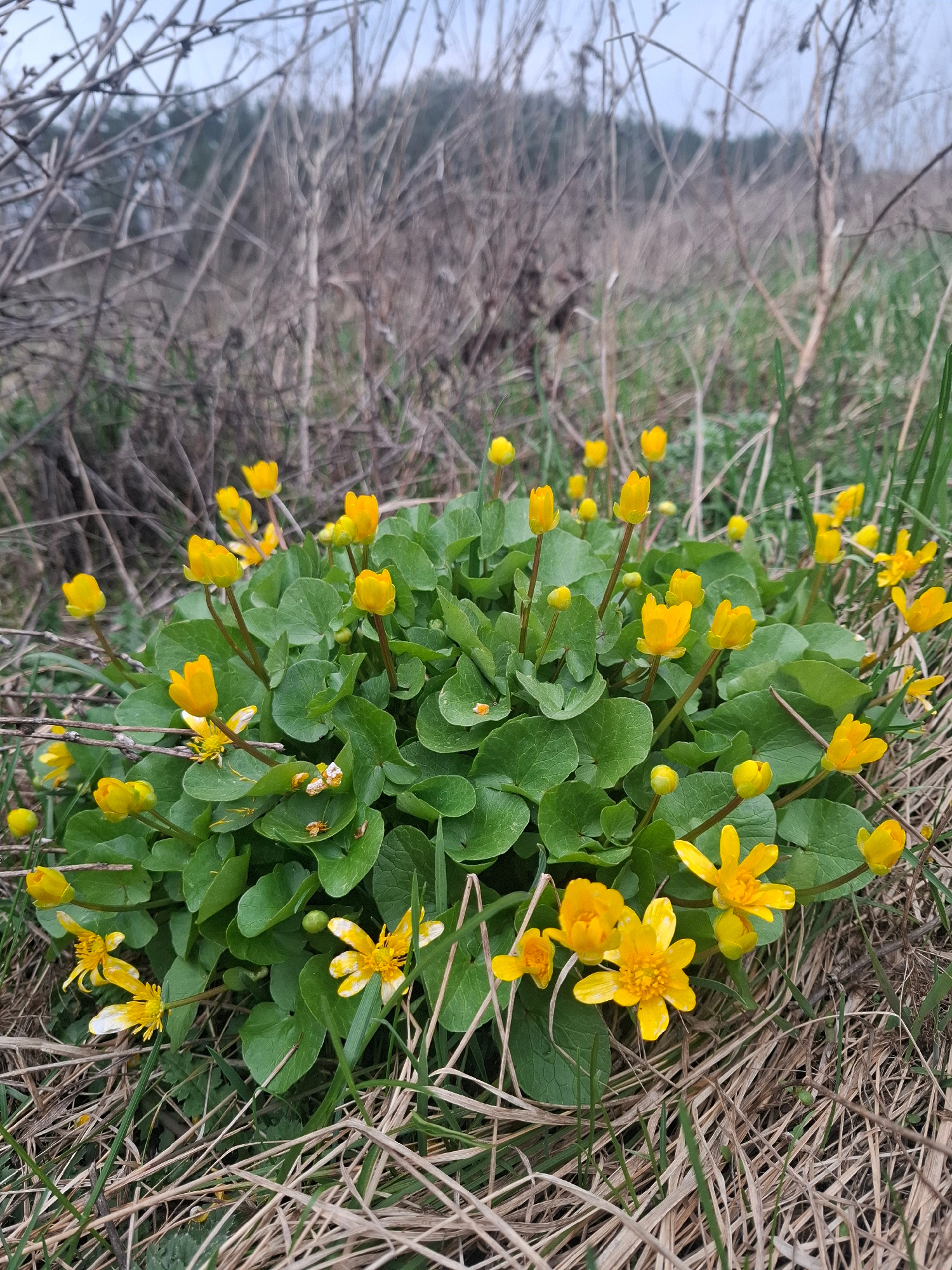 The image depicts a patch of bright yellow flowers with rounded green leaves, surrounded by dried grass and bare branches. The location is specified as Khlevnoye, Russia, though there are no elements…read more