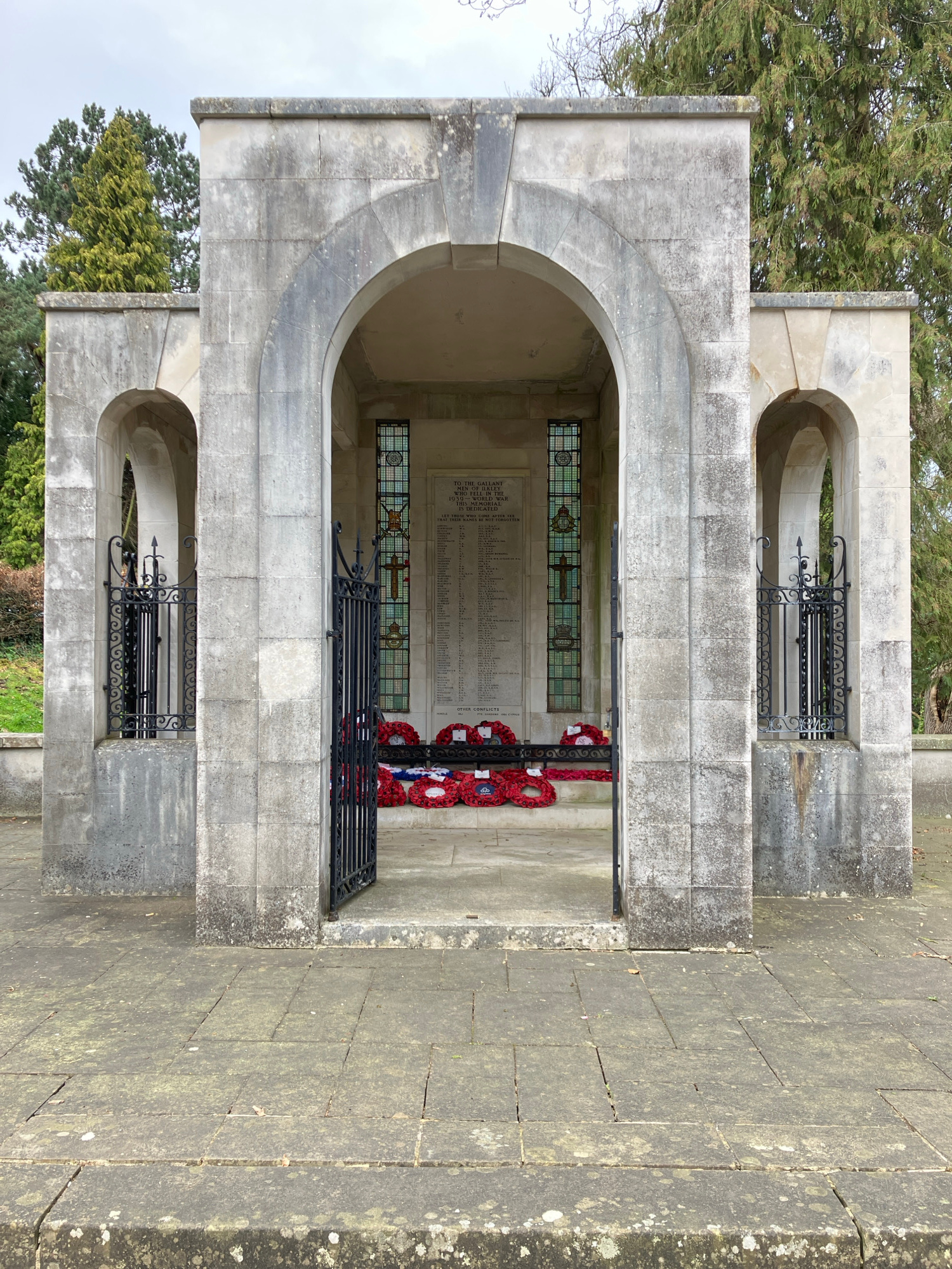 A large stone war memorial stands under an overcast sky, likely in Ilkley, Bradford, United Kingdom. The structure features a series of arched openings, with the central and largest arch housing the m…read more