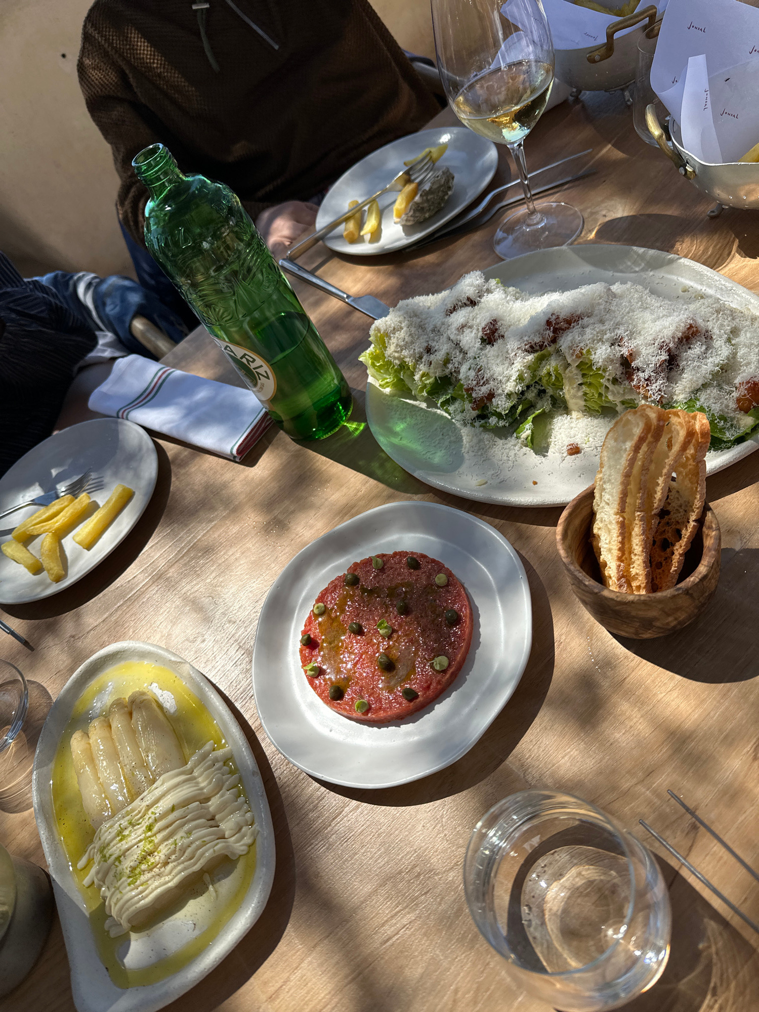 An overhead shot captures a variety of dishes on a wooden table, likely in a restaurant in Sant Josep de sa Talaia, Spain. A Caesar salad liberally sprinkled with grated cheese and bacon bits, accompanied by toasted bread in a wooden container, is present. A red steak tartare garnished with green capers and drizzle of olive oil sits on a white plate. A side dish of white asparagus with sauce is also visible. A green glass bottle, presumably of water, is on the table. There are multiple sets of silverware and glassware. Part of a person is visible to the left of the bottle, wearing a dark jacket and jeans. The lighting suggests a bright, sunny day. | Open Wire