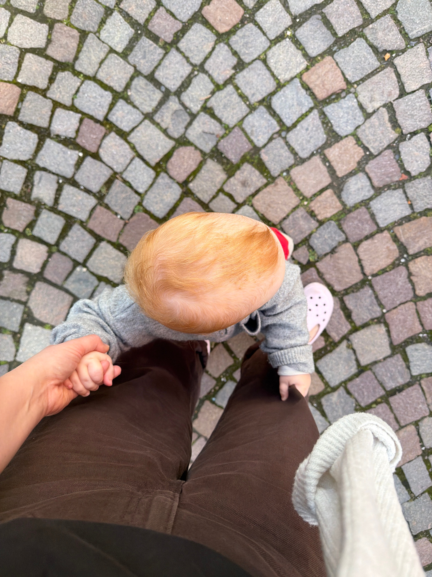 An overhead shot captures a baby being guided by an adult on a cobblestone path in Meisenheim, Germany. The view looks directly down at the top of the baby's head, which has light blonde hair, and par…read more
