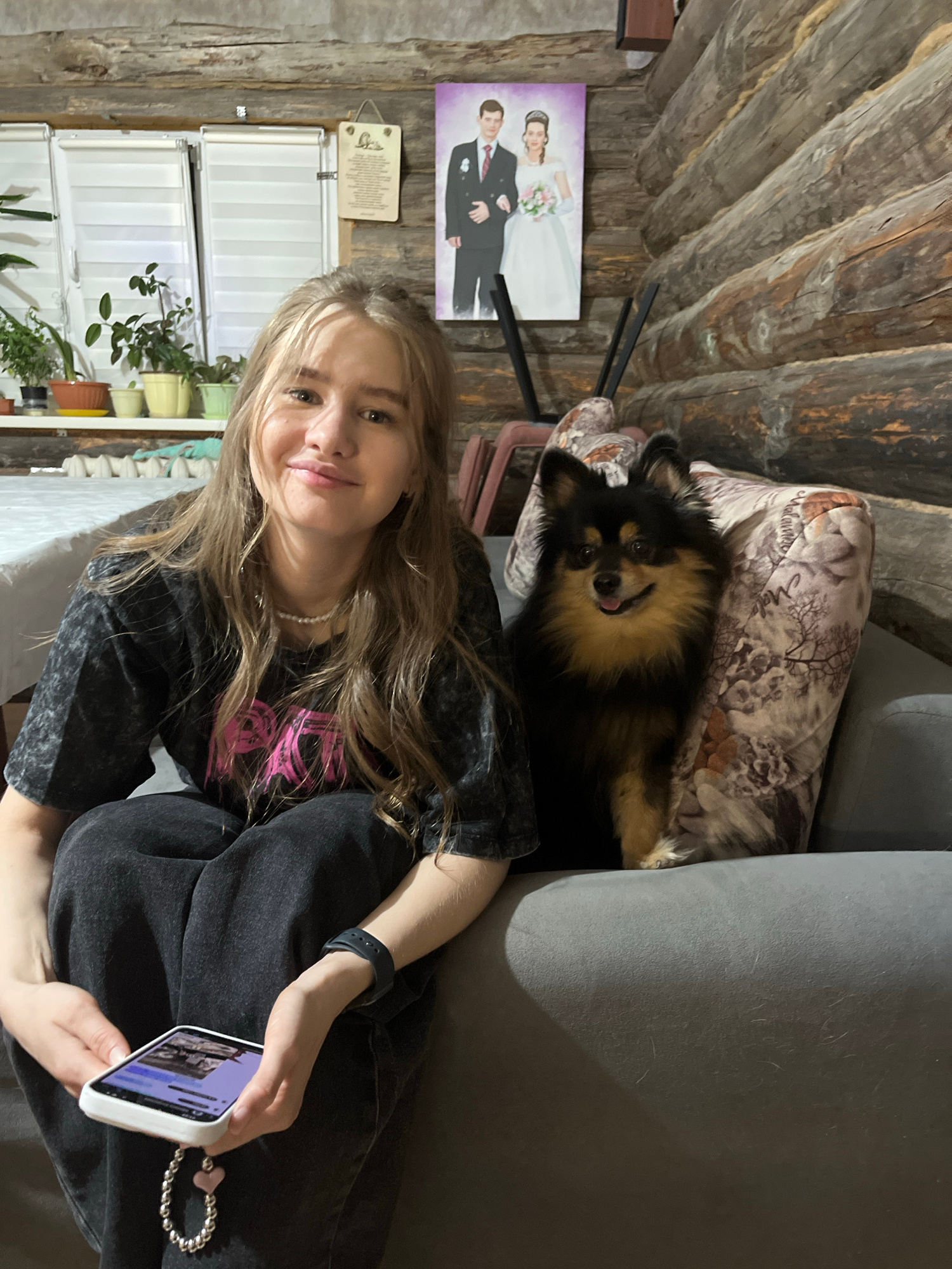 A person with fair skin and long blonde hair is seated on a gray couch, holding a white smartphone in their right hand. The person is wearing a dark gray T-shirt with a pink design and dark jeans. To…read more
